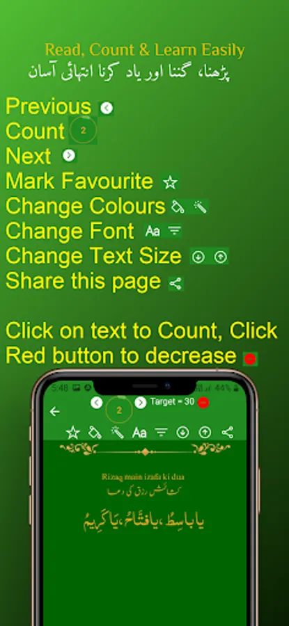 This app is simple to be used for both beginners and pro users, help learn and count recitations of Azkar, Duas, Verses and Suras from the Holy Quran. Another Extra Counter is provided for recitations of large numbers.