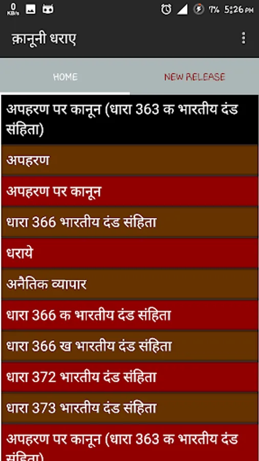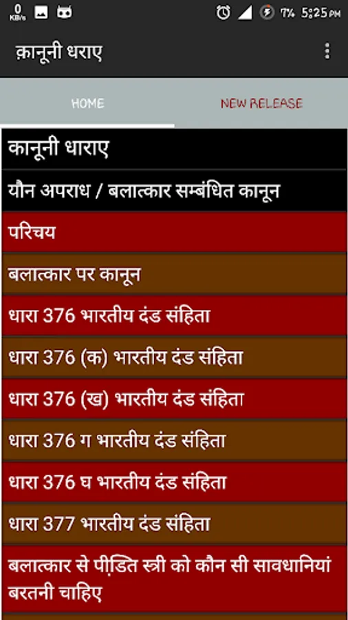 You can find all kind of indian law in this app like IPC,Crpc,family law,women law ,property law etc.