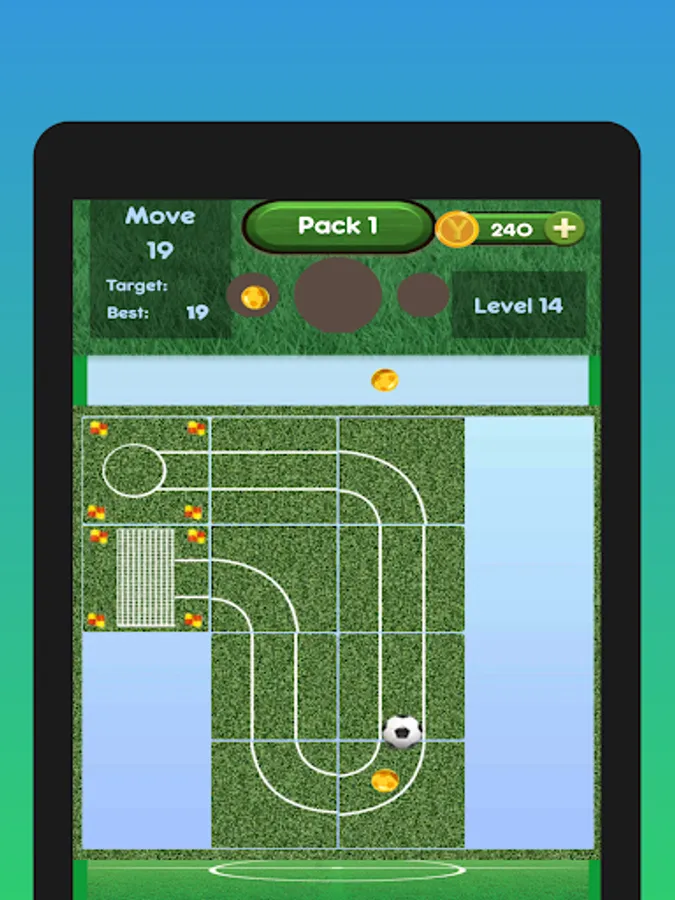 push the blocks of the soccer field with your finger and find a way for the ball to score a goal.