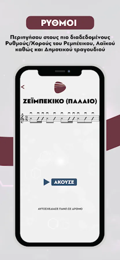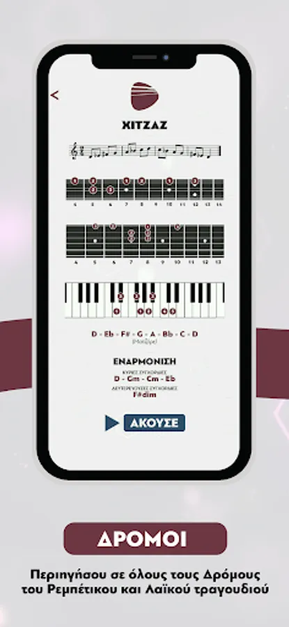 Browse all the Streets of Rebetiko and Folk song, the most popular Rhythms / Dances of Rebetiko, Folk and Folk song and learn the 3 types of Chords on the bouzouki easily and effectively, from your mobile phone completely free!
