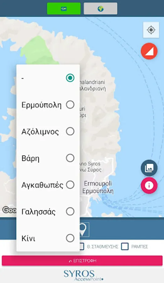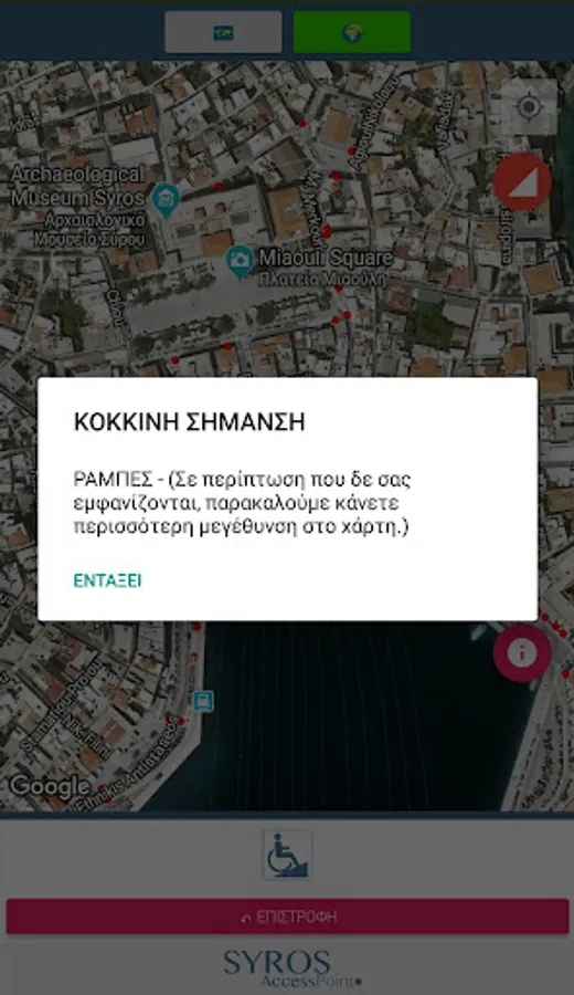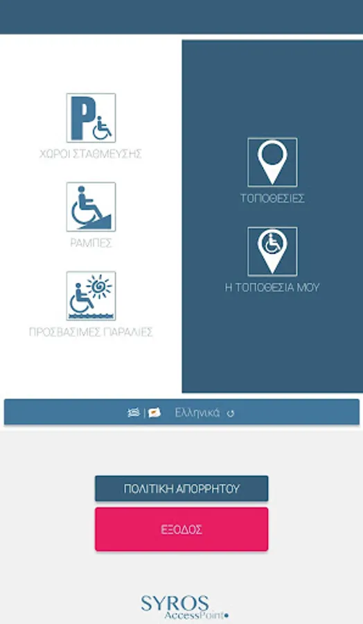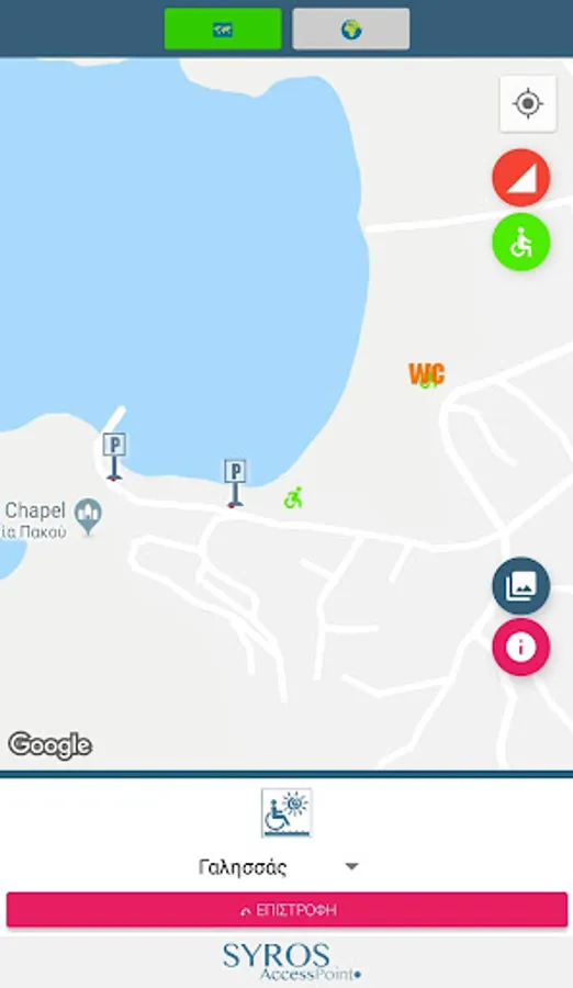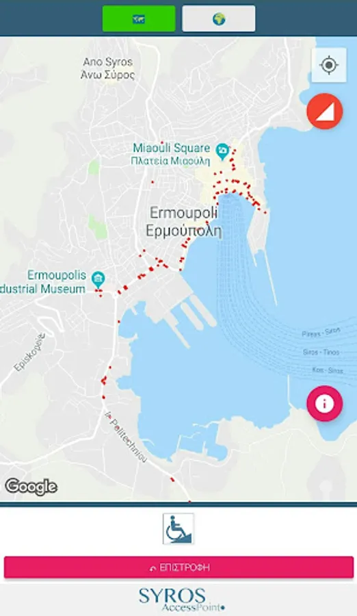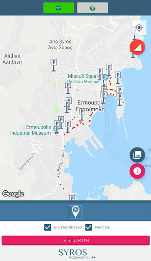 SYROS AccessPoint • This is a free non-profit application designed to help people with disabilities in Syros, Cyclades. The application presents all registered parking spaces for people with disabilities, all the ramps of Ermoupolis and the seaside settlements and all the accessible beaches of the island, contributing to the effective movement of both island residents and visitors facing motor problems.