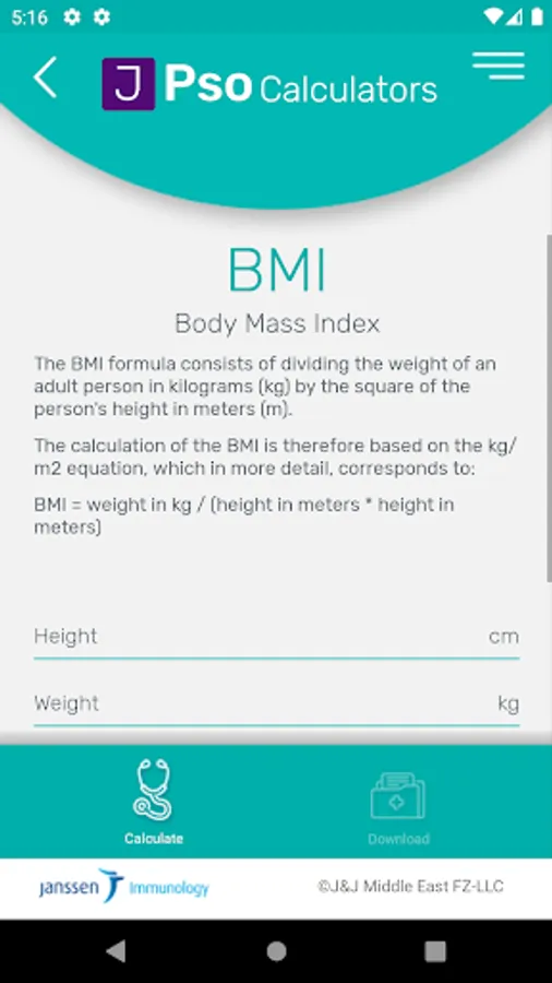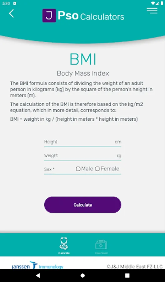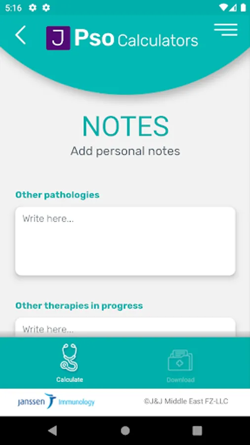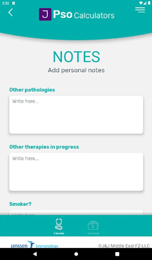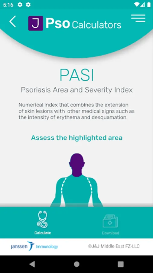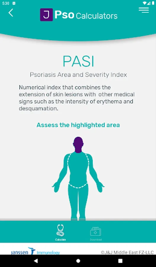 JPSO Calculators is a mobile app active in the therapeutic area of Dermatology. The purpose of the app is to calculate some scores relating to psoriasis. During the visit of the patient, JPSO Calculators allows the dermatologist to calculate specific parameters of this pathology.
