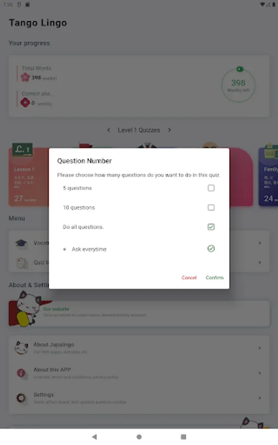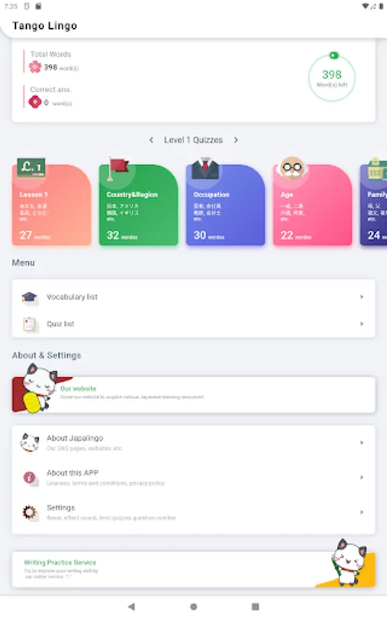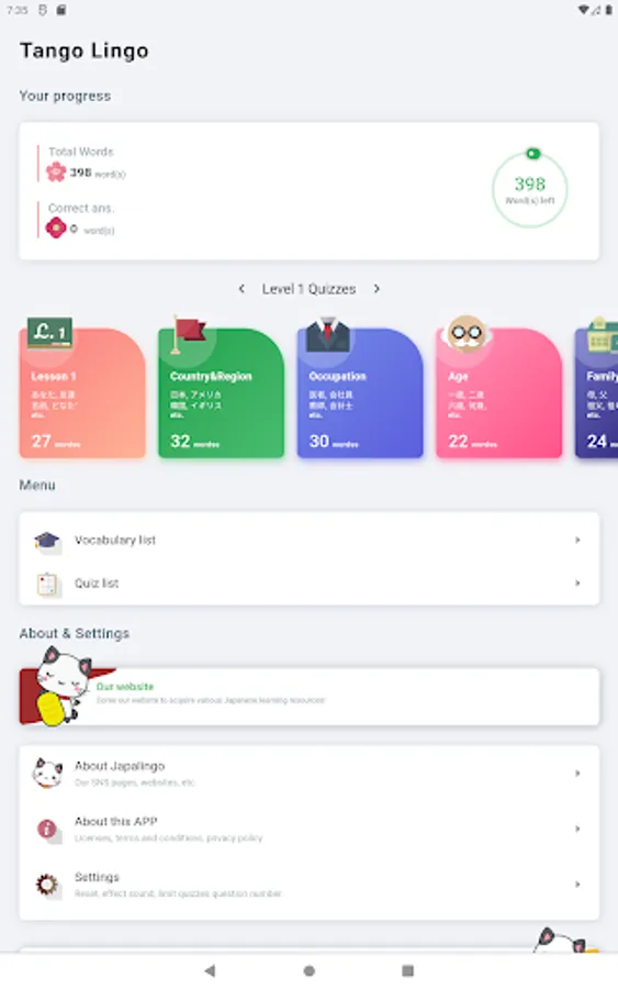 Tango Lingo is made by Japalingo, which provides various service for Japanese learners. For more news, details of our service, free learning materials, follow us on Instagram, Youtube, Facebook, and Twitter @japalingo Our website is japalingo.com