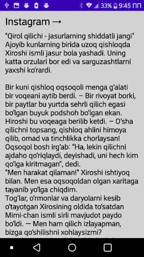"Men harakat qilaman!" Xiroshi ishtiyoq bilan. Men esa oqsoqoldan olgan xaritaga tayanib yo‘lga chiqdim.