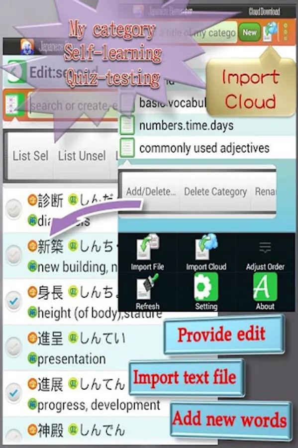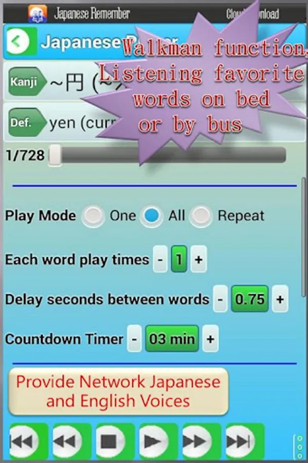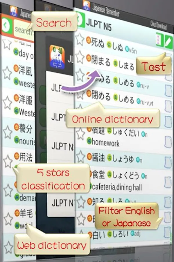 Japanese Remember is a helpful tool to learn the Japanese language and prepare for the JLPT exam by studying JLPT vocabulary. It contains a dictionary of over 7,000 words required for the exam across N5 to N1 levels which can be searched on using kanji (hiragana/katakana) or English definition.