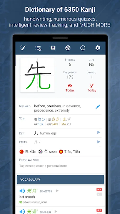 ✓ Powerful kanji search tools by radicals, meanings, on/kun readings, JLPT levels, etc.