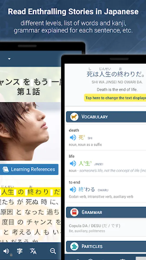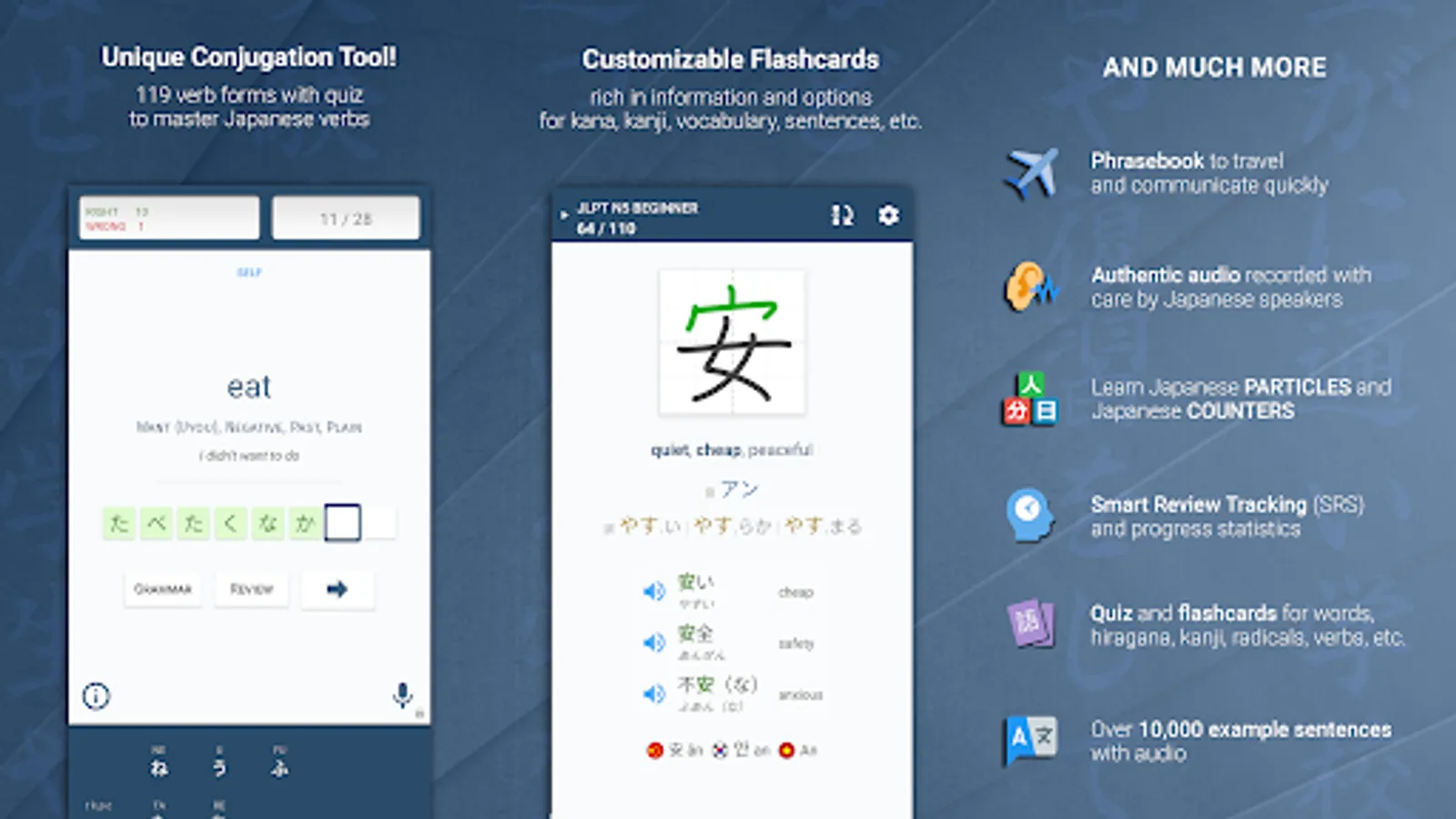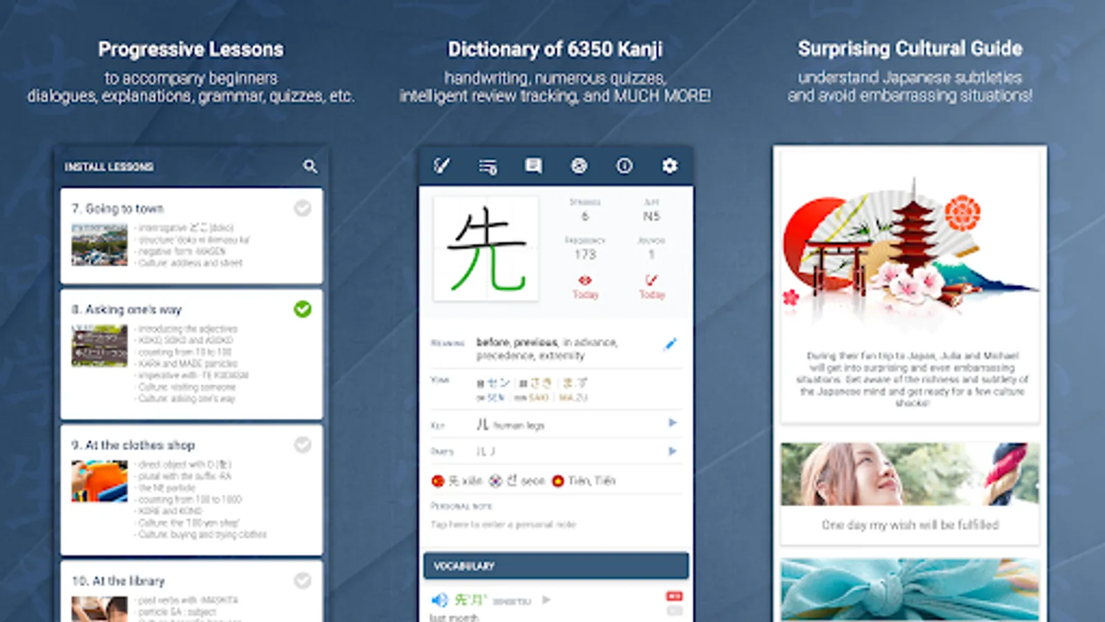 All-in-one application to learn Japanese. Hiragana, katakana, kanji, vocabulary, phrasebook, grammar, and MUCH more! Basic to advanced lessons. Smart progress tracking exercises to improve your writing, reading, speaking and listening skills. Discover surprising culture facts to think like a Japanese, and avoid embarrassing situations.