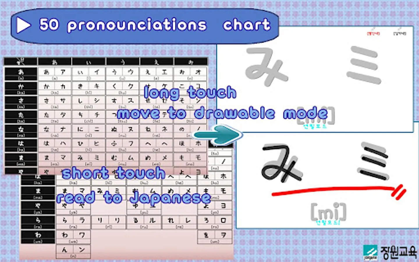 2. 50 pronounciations : The table of 50 pronounciations. You could listen that reading with touch it.