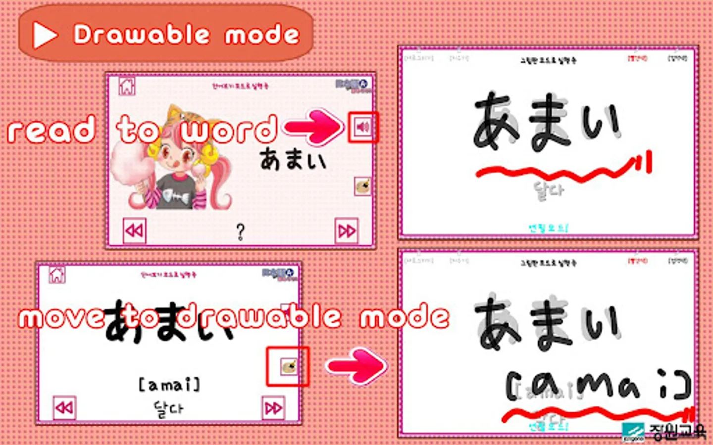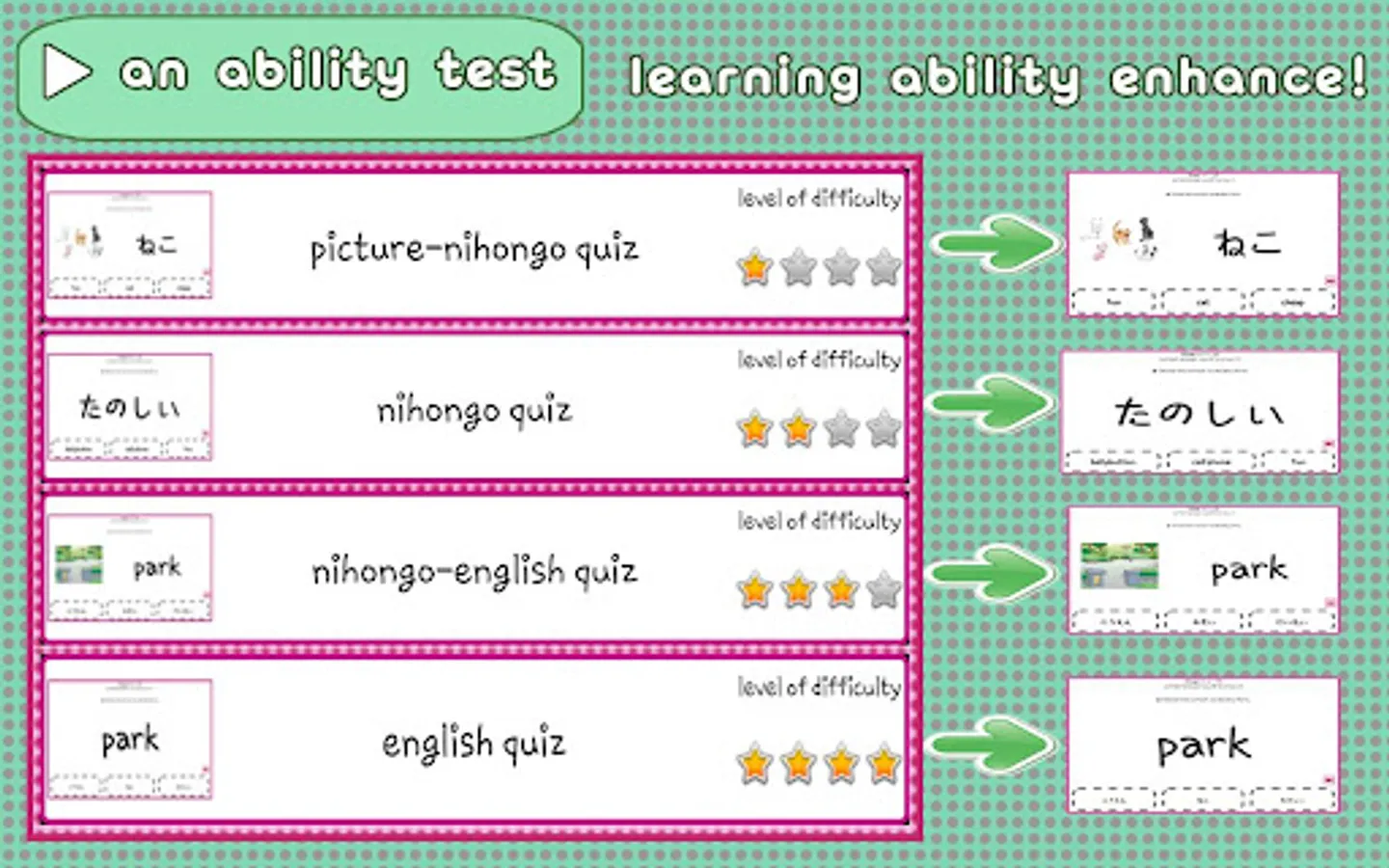 3. problem solving : There are 4 types of test; picture+japanese, picture+english, japanese, english.