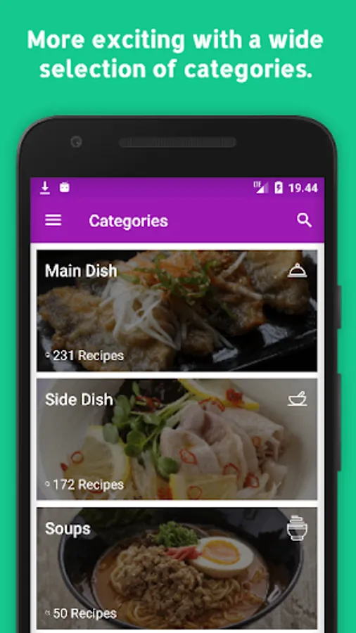 There are various categories including main meals, side meals, snacks, drinks and dessert. You can make your recipes as favorites easier to find.