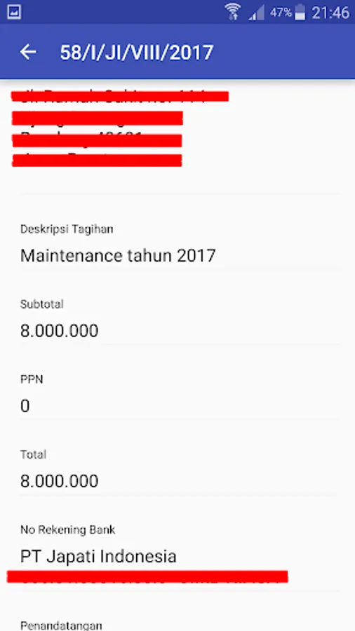 The implementation of Law number 11/2008 concerning Electronic Information and Transactions Article 11 states that electronic signatures have legal force and legal consequences, meaning that the legal power of electronic signatures is the same as wet signatures. This Digital Billing (TD) application aims to verify and validate the Digital Signature on invoices issued by PT Japati Indonesia in accordance with the standards provided by Article 11 of the ITE Law. Japati clients using the Digital Bills application scan the QR code on the invoice sent by PT Japati, and after being validated by the TD application, match the information on the invoice with the information displayed by the TD application. If the information displayed is the same and matches, then the invoice has been validated from PT Japati Indonesia. The advantages of using a digital signature are as follows:
