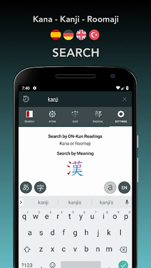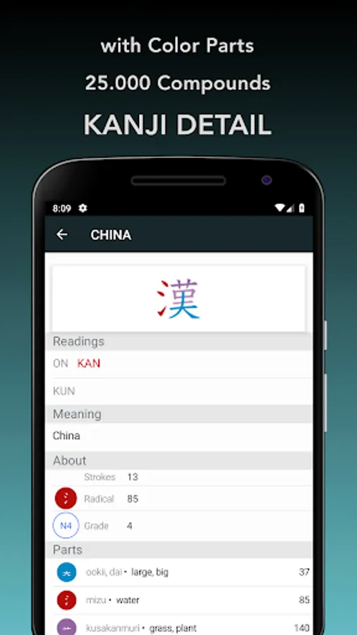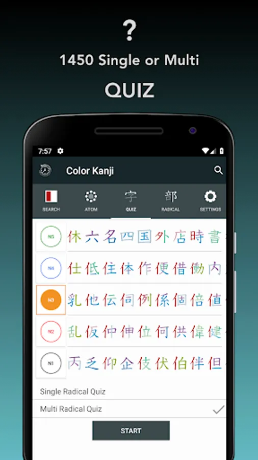 - Each kanji has a Single and Multi Kanji Quiz at JLPT level.