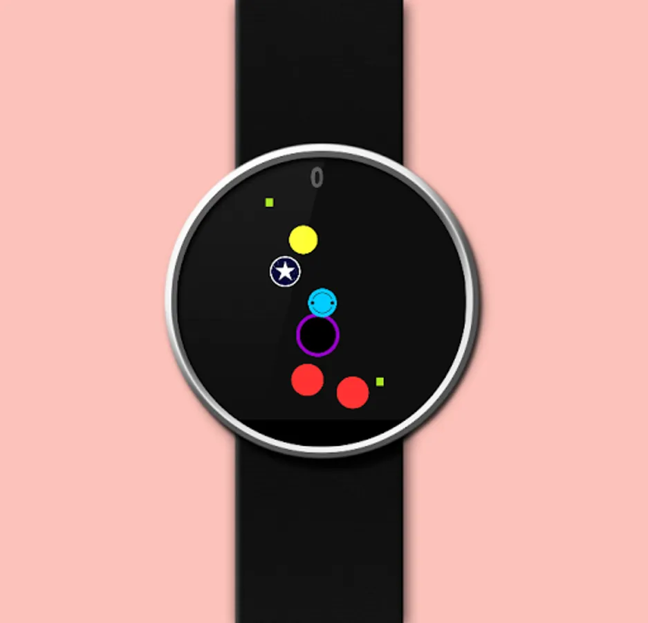 In this game you control the blue ball with your taps. Hit the yellow ones with blue, bump a red to another red, make the purple one fall into the hole and hit the star fast to make it fly and get 5 points for each.