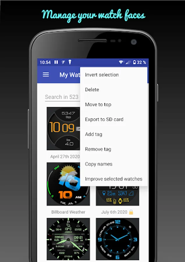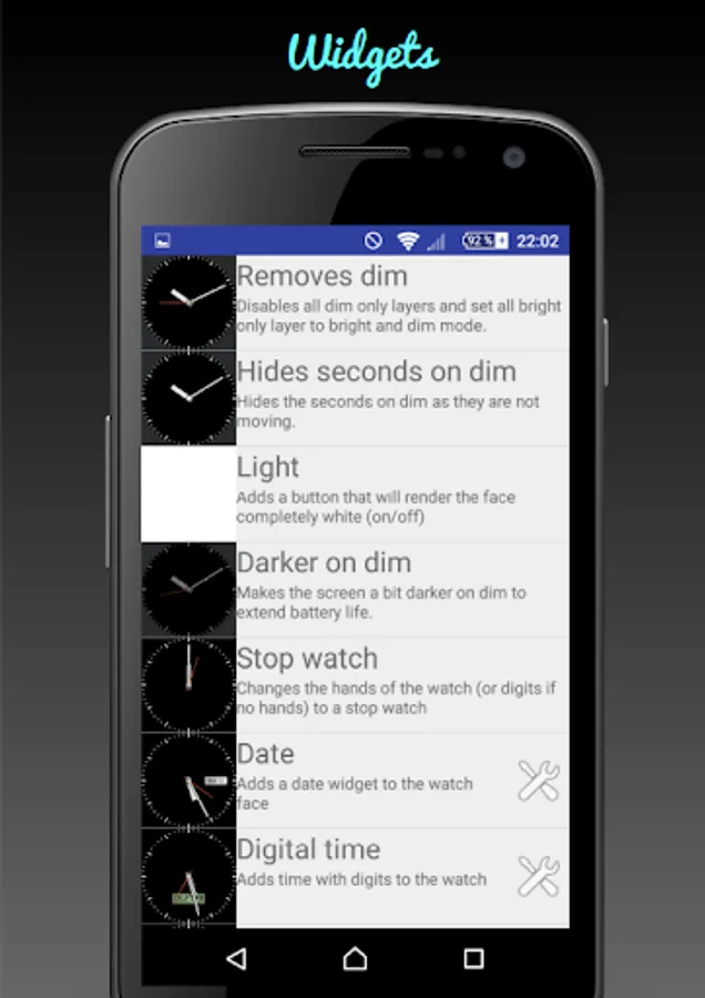 * Widgets, export to SD card, install from back-up don't work for protected watch faces. Protected watch faces are visible with the lock at the end of the title.