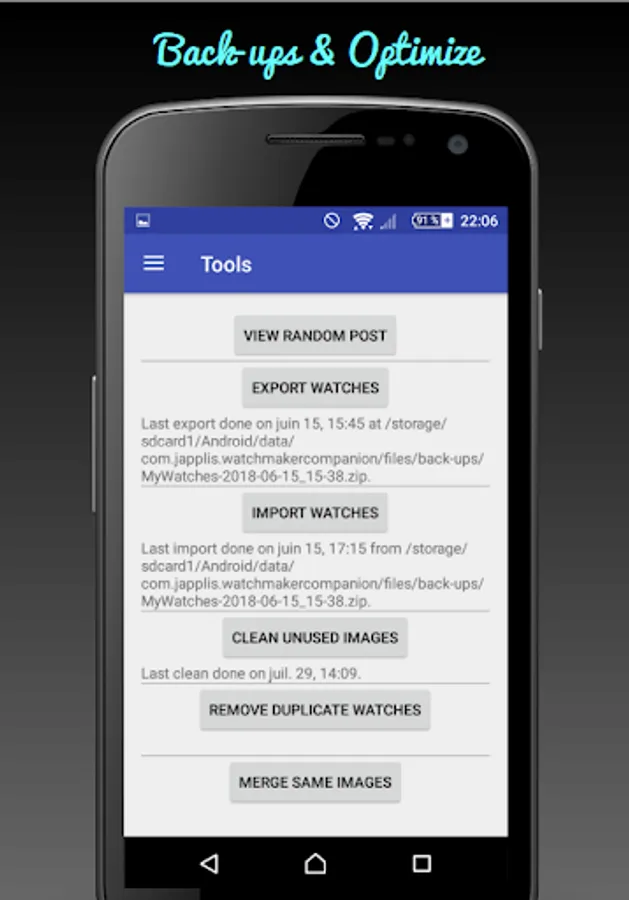 Back-ups and SD Watches are located in SD Card/Android/data/com.japplis.watchmakercompanion/files. If you don't have a SD card it will be in Internal storage/Android/data/com.japplis.watchmakercompanion/files.