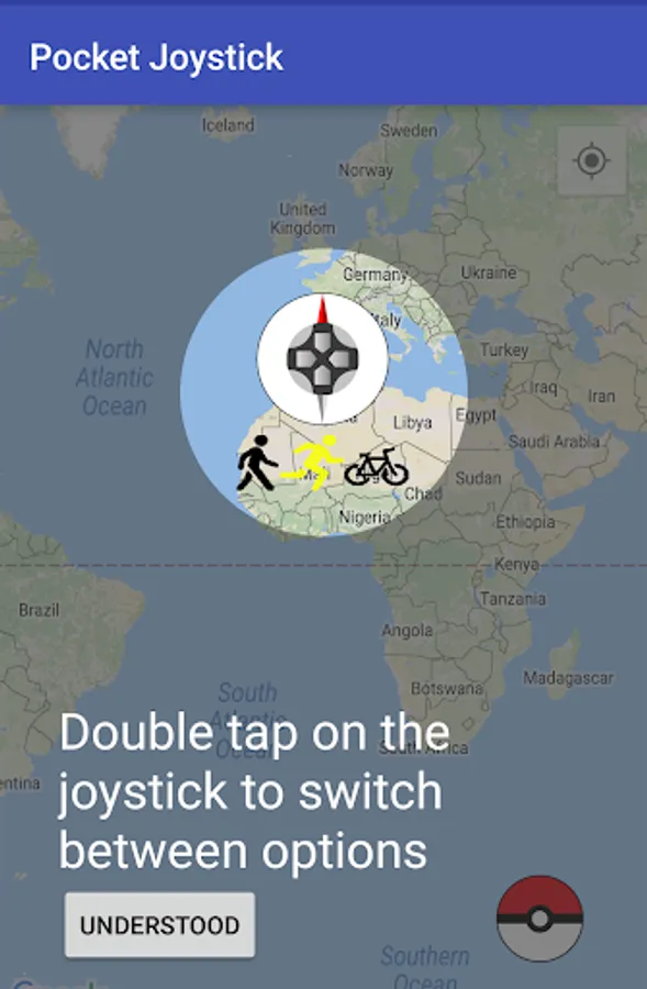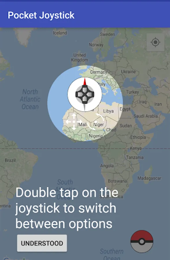 The virtual joystick overlays over any application and allows you to interact with your mocked location easily. The compass rotation feature is perfect to navigate to the correct direction.