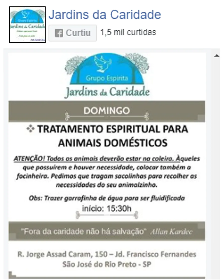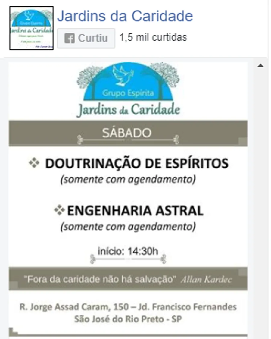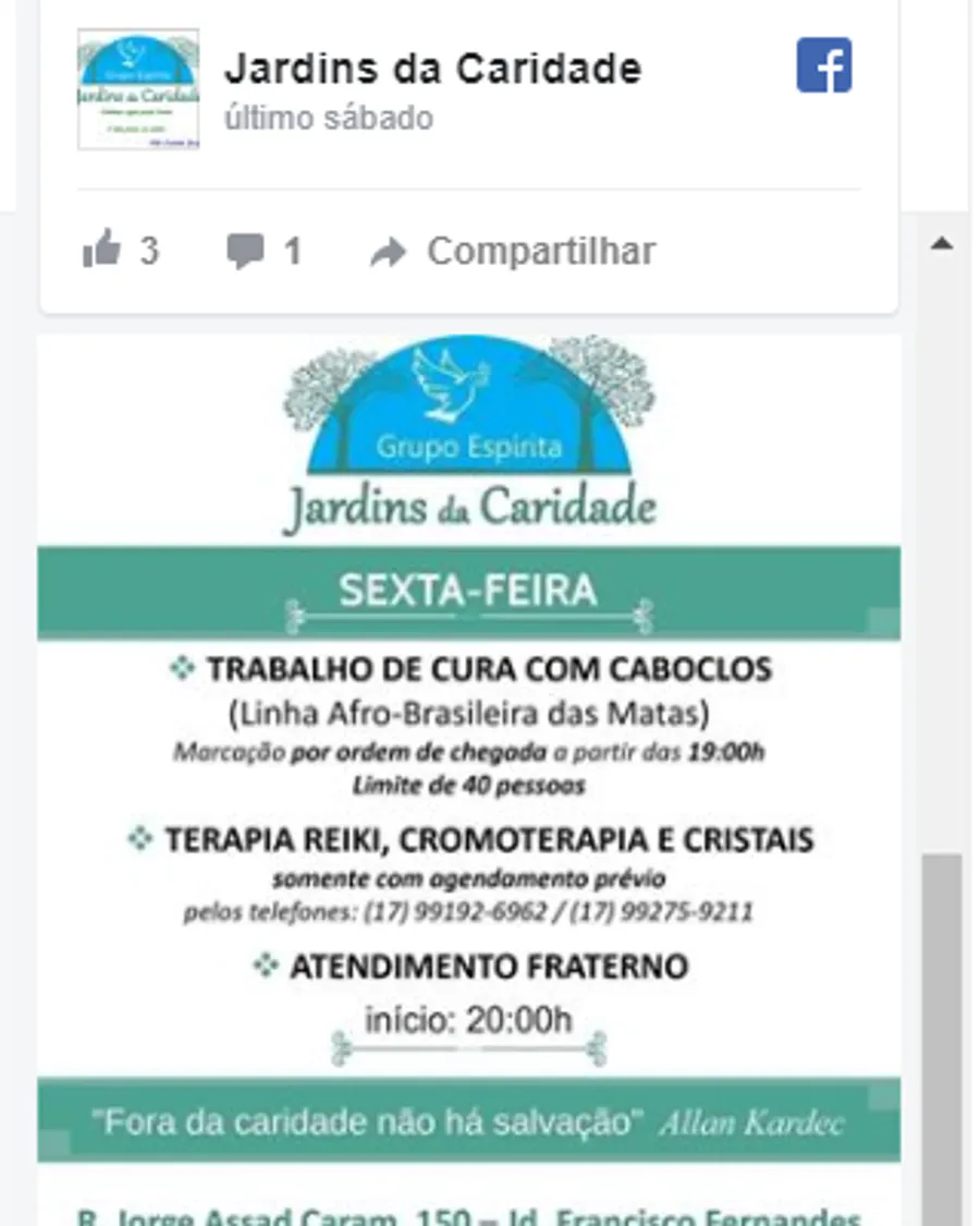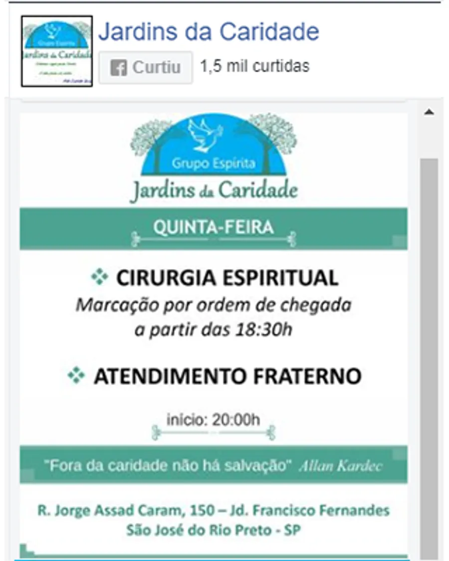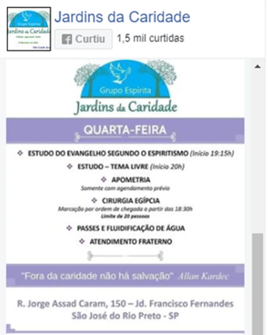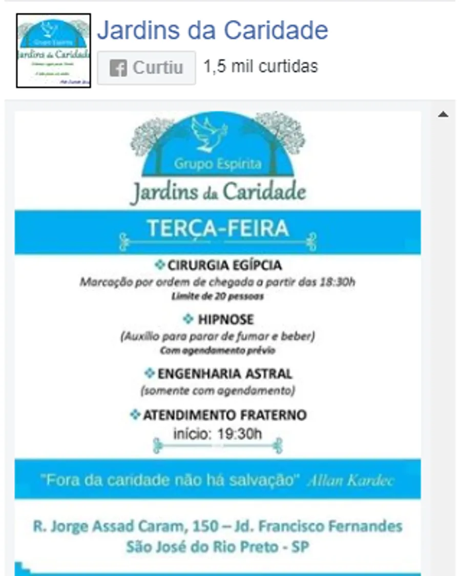 Reiki therapy, chromotherapy and crystals, lecture, passes and fluidization of water, Egyptian surgery, hypnosis, astral engineering, fraternal care, study of spiritist doctrine, apometry, treatment for illnesses and addictions, healing work with Afro-Brazilian line, indoctrination of spirits , spiritual treatment for domestic animals. Attention bring water bottle to be fluidized.