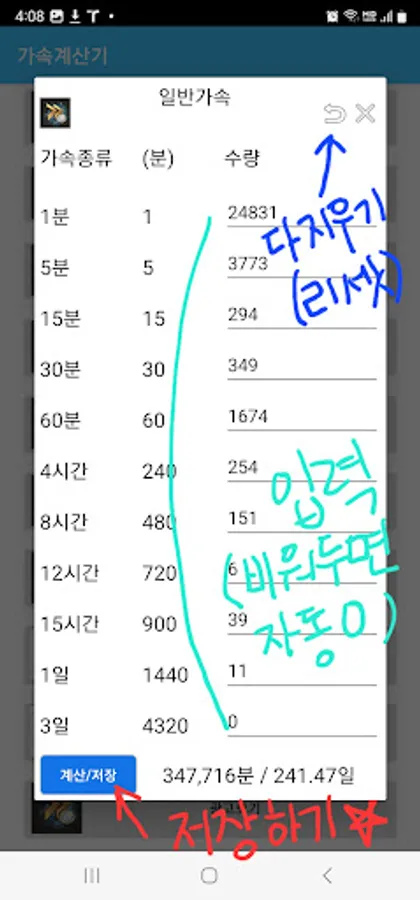 After directly inputting the item quantity, the total sum is displayed in minutes and as a date