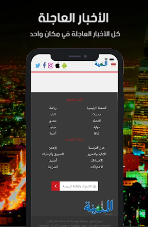 يقدم تطبيق المدينة الإخباري عصارة الأخبار، يختار لك باقة من أحدث وأفضل الأخبار عالميا وخليجيا وعربيا، بشكل مبتكر بهدف إحداث ثورة في مجال الخدمات الإخبارية اليومية، حتى نصبح المنصة الإخبارية الرائدة بالشرق الأوسط وشمال إفريقيا.
