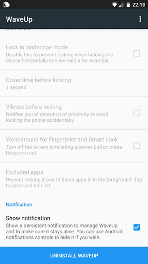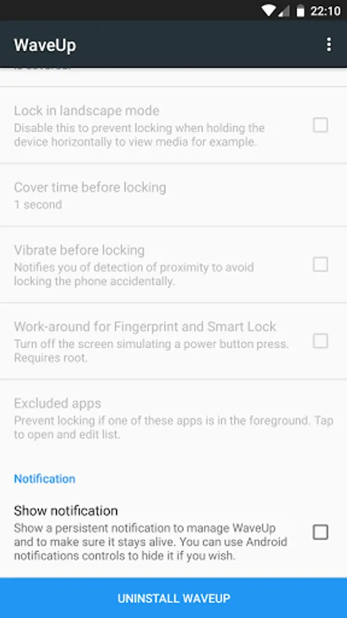 This app uses the Device Administrator permission. Therefore you cannot uninstall WaveUp 'normally'.