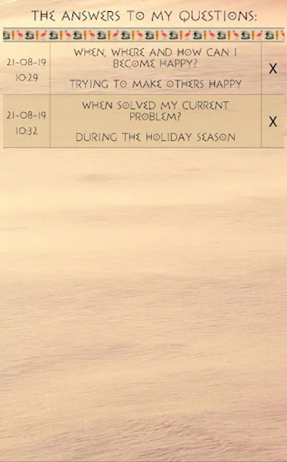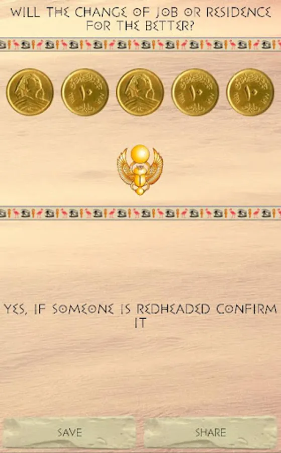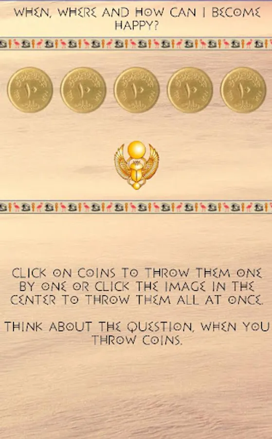 "The book of fate" contains a list of the 32 questions, half of which is available for free divination. Selecting the question you want to answer, you need to flip five coins and find out what made you fate. You can throw all the coins at once, and each can in turn. Questions and answers adapted to the modern man.