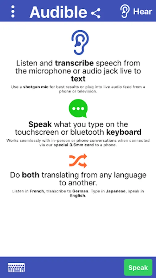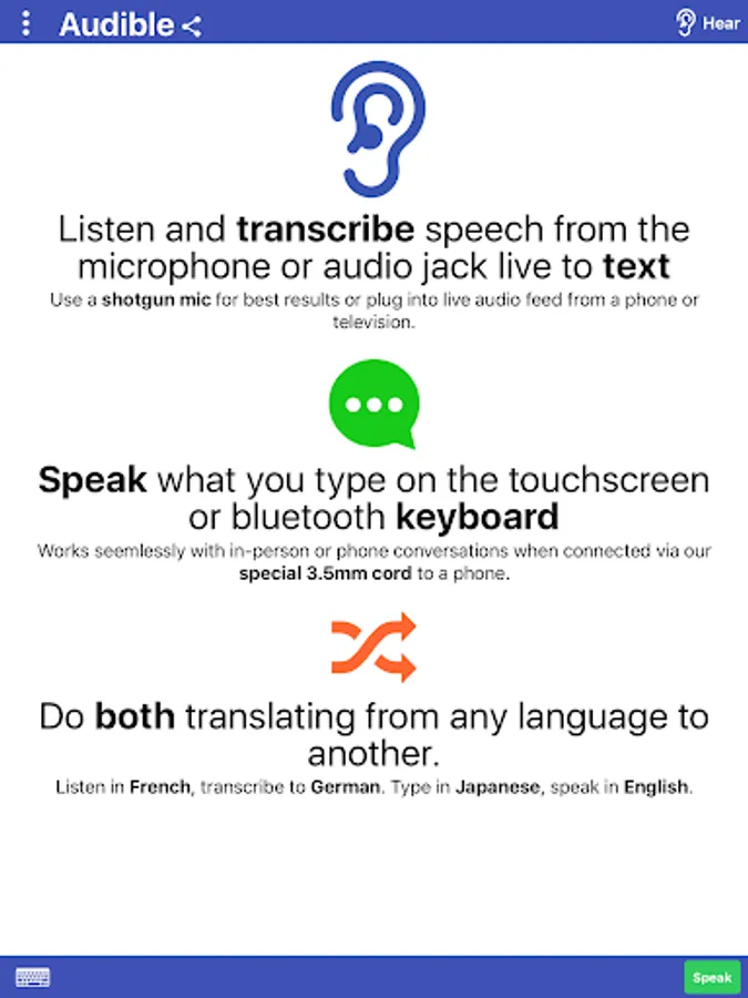 Audible is a free, non-profit app that revolutionizes the way the deaf communicate, supporting extraordinarily fast speech to text results, robust text to speech and fluid translation for both.
