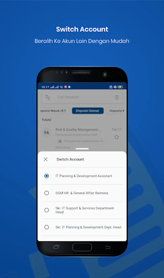 1. Account is a feature where employees can change accounts according to the position they have, so they can see the Manuscripts and Dispositions made by the unit leader.