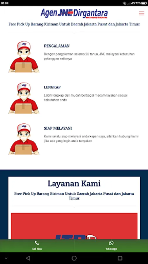 The JNE Dirgantara Android application was created to help customers, online shops, companies, and anyone who wants to use JNE shipping services in East Jakarta and Central Jakarta.