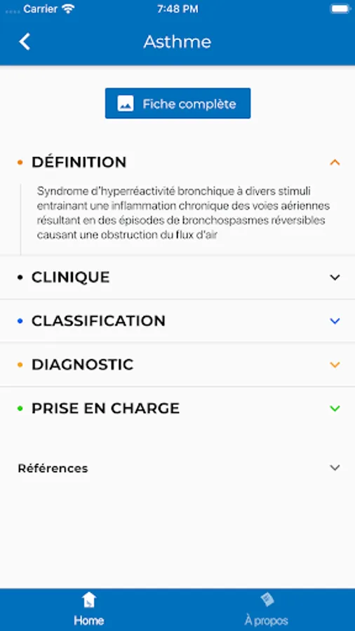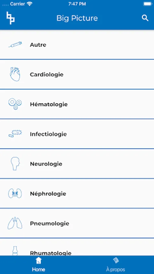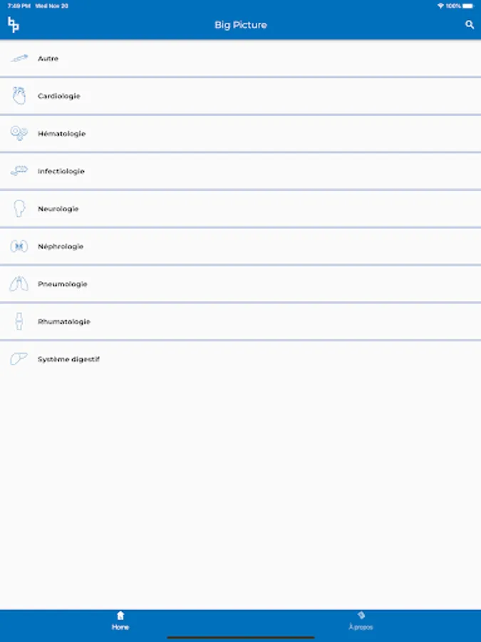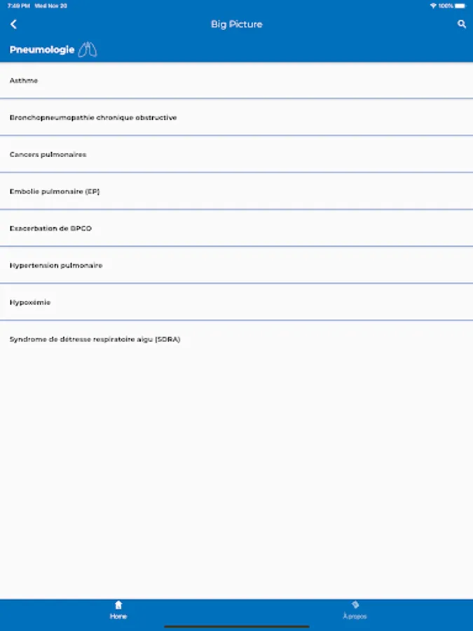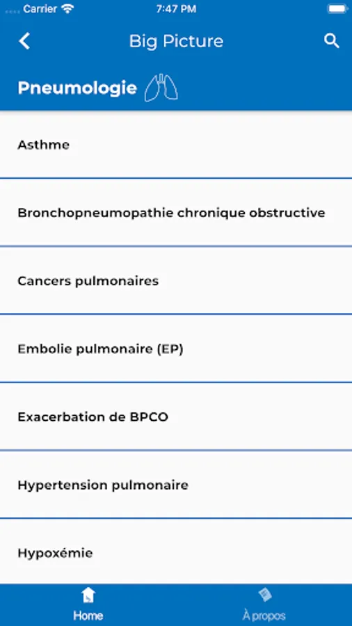This application is intended to be useful for the daily practice of the young doctor. Its aim is to provide a global view (“big picture”) of the definitions, etiologies, classifications, diagnoses, management and / or treatment of various pathologies (mainly general internal medicine). Pathologies or symptoms are presented in the form of lists and review sheets quickly accessible on your smartphone.