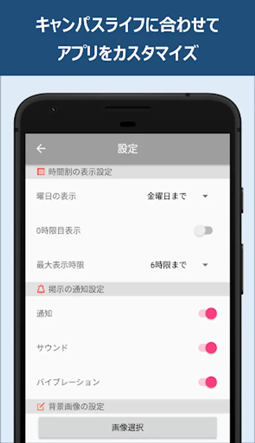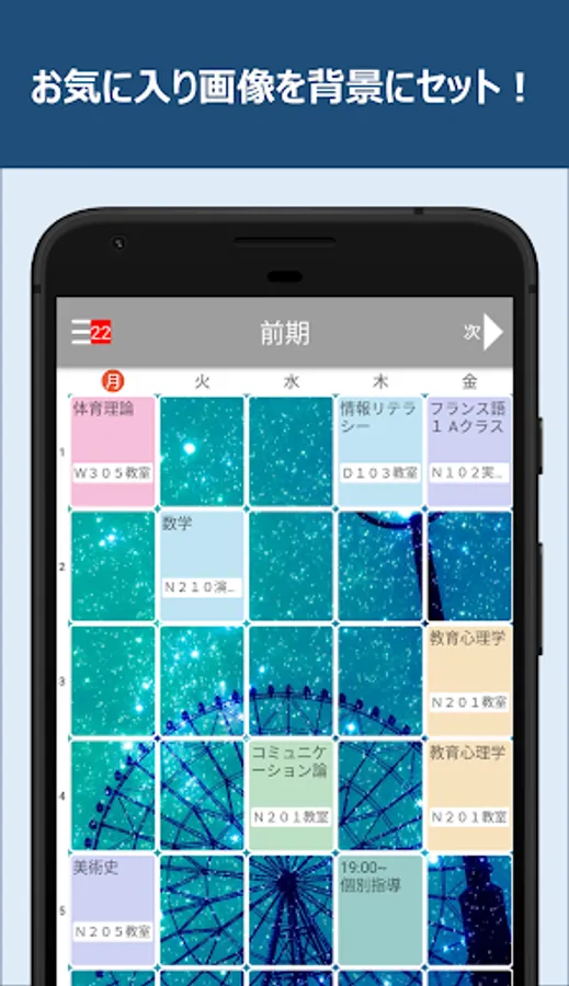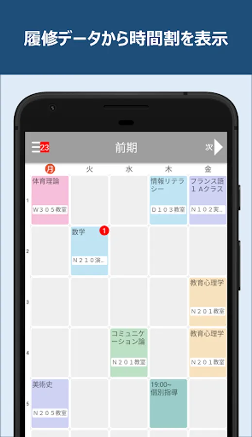 設定機能で0時限目を表示すれば、朝練など授業前の予定も登録可能です。