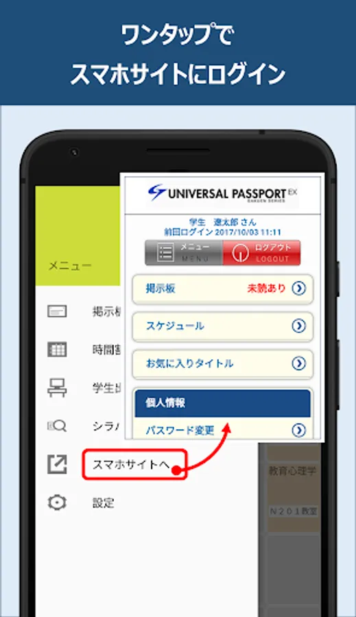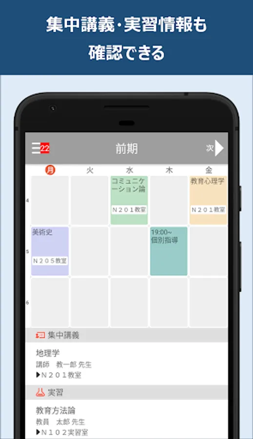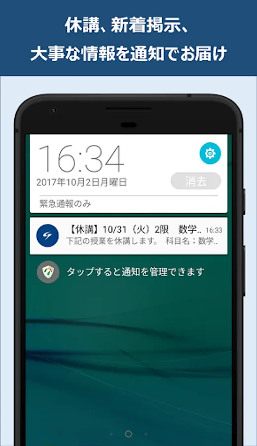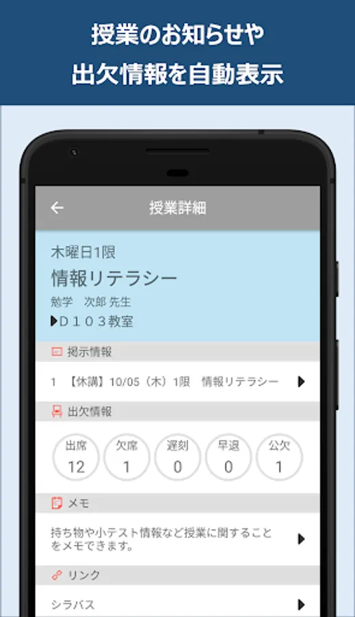 IC出欠端末と連動し、授業開始前にプッシュ通知。大事な授業への遅刻を防げる。
