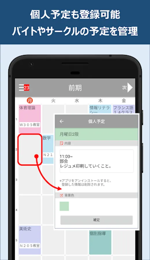 部活やバイトなど、毎週決まった予定を時間割表で管理できます。