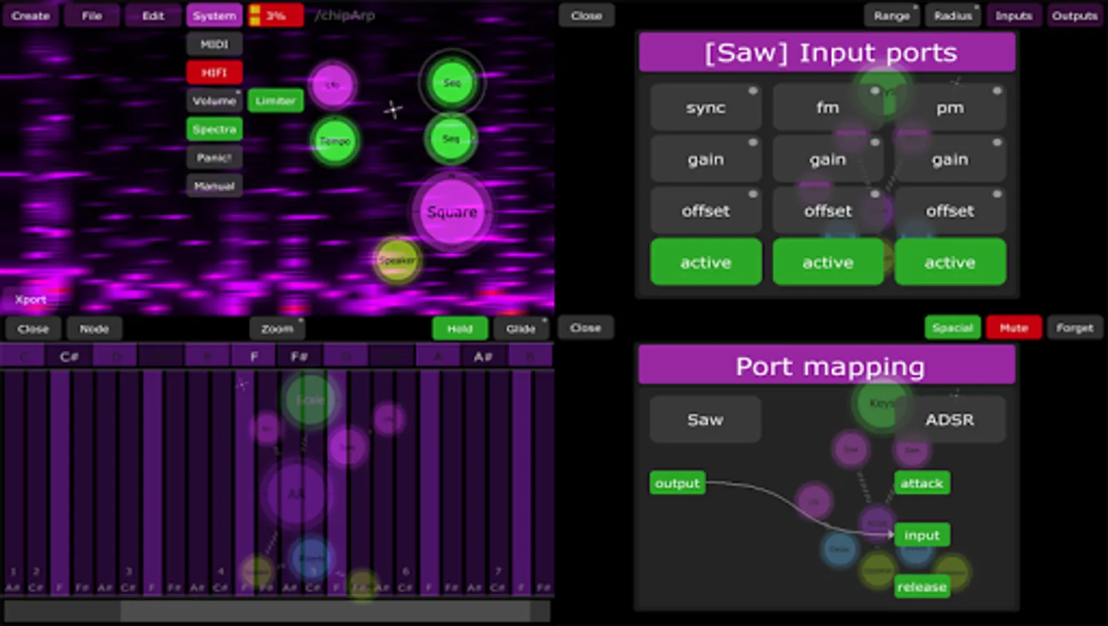 - New nodes: Abs, Clamp, Delay2, Pan, Group/GRecv/Gsend, MidiNote, MidiCC & Synced