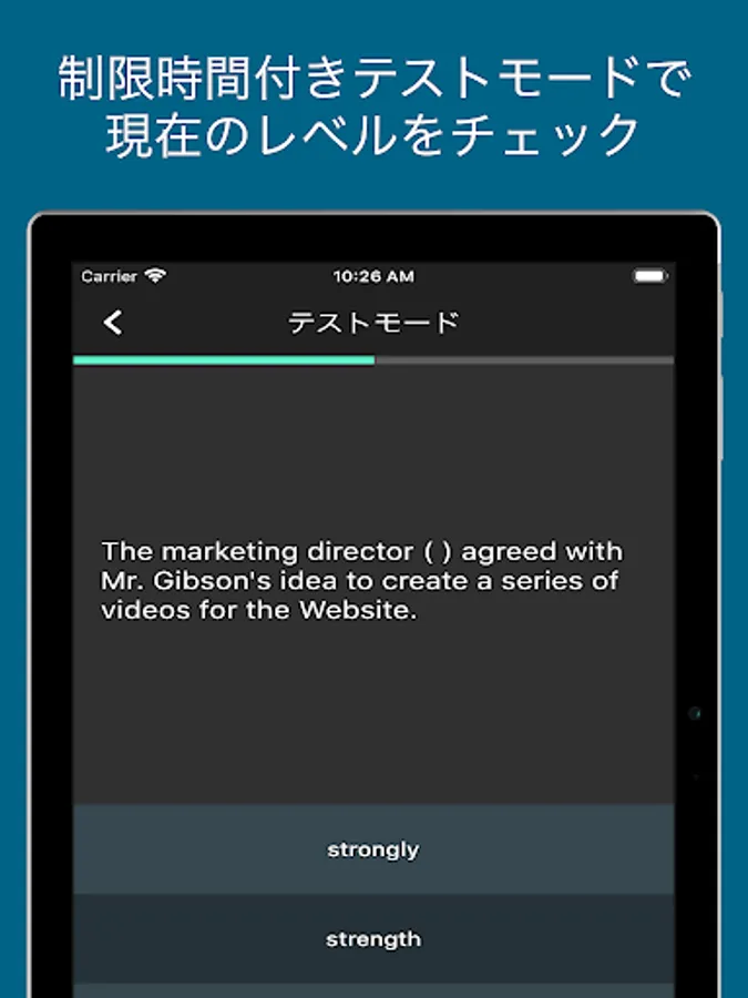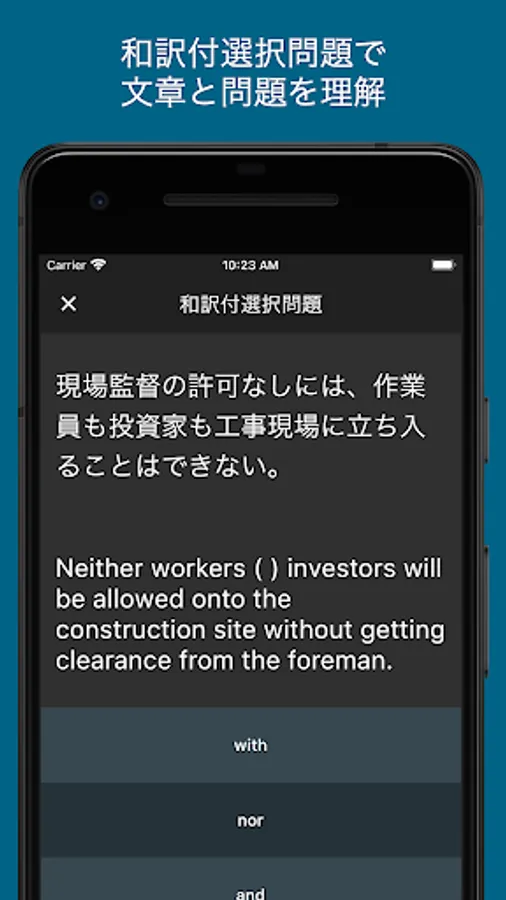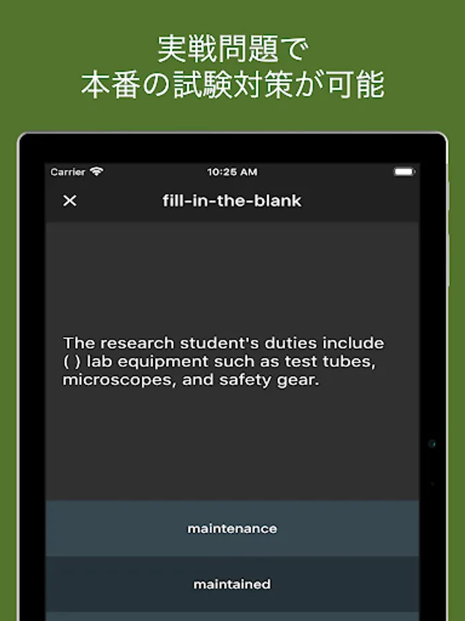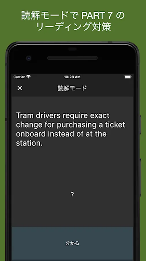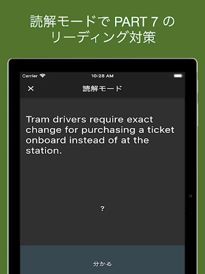 The purpose here is to read TOEIC-like English sentences. Select ◯ if you can read the displayed text, and x if you cannot. Although it is a simple task, you can check your vocabulary and reading comprehension by distinguishing sentences that you understand and sentences that you do not understand. On the detailed screen after answering the questions, important items such as vocabulary and grammar are explained together with the Japanese translation.