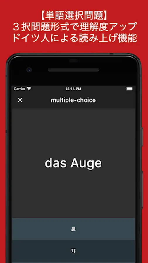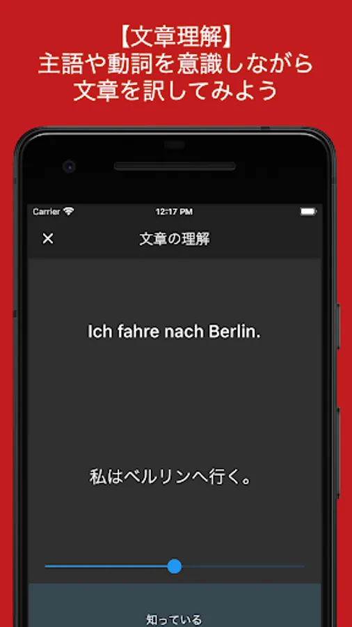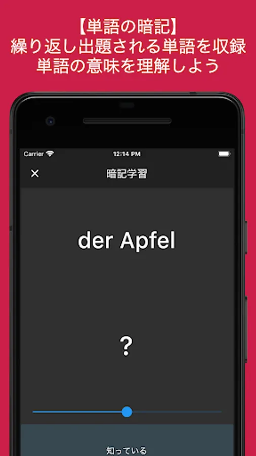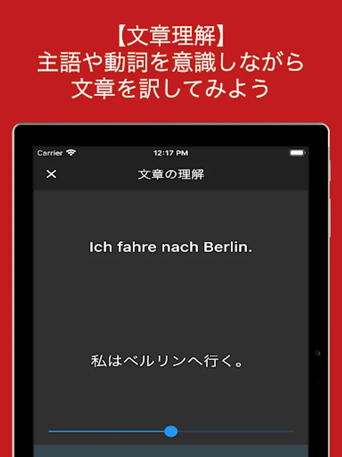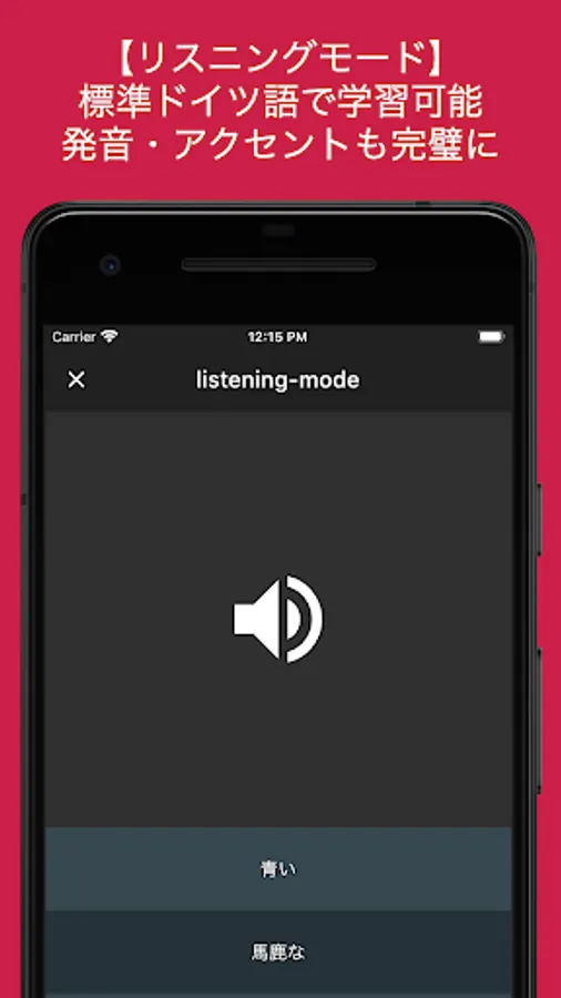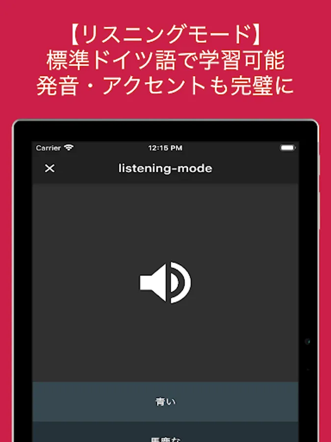 画面上部にドイツ語が表示されます。「?」をタップすると正解が表示されるので、その単語の意味を知っているか否か、まずは知識を整理してください。全ての問題を暗記すると次のレッスンに進めます。音声速度を変える機能もついているので、無理なく自分のペースで学習を進めることも可能です。