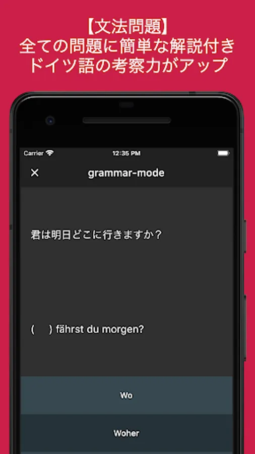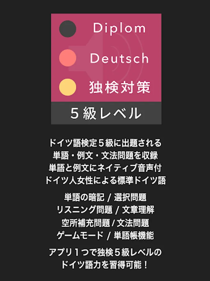 本アプリはドイツ語検定5級対策用のアプリです。毎回試験に出題される単語・例文・文法問題をドイツ人女性による標準ドイツ語の音声と共に学習します。