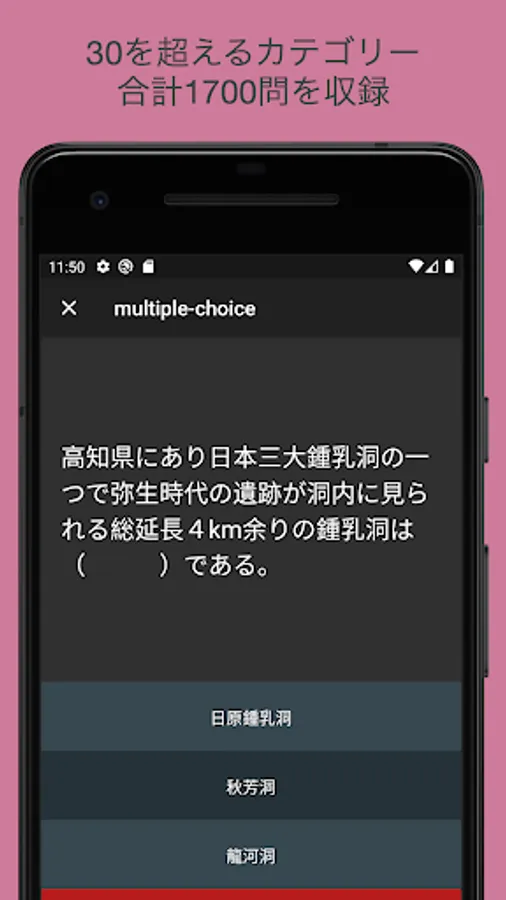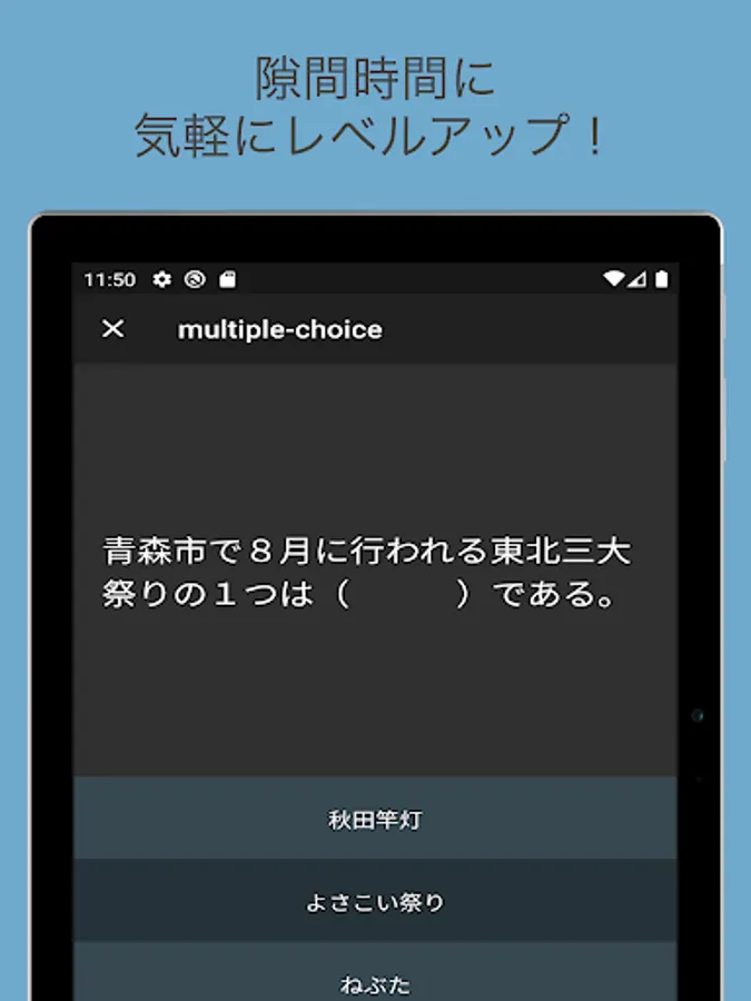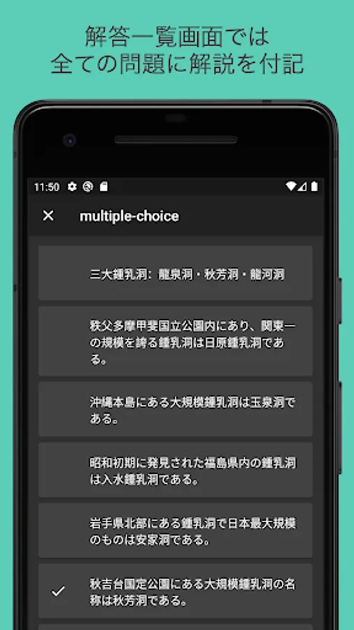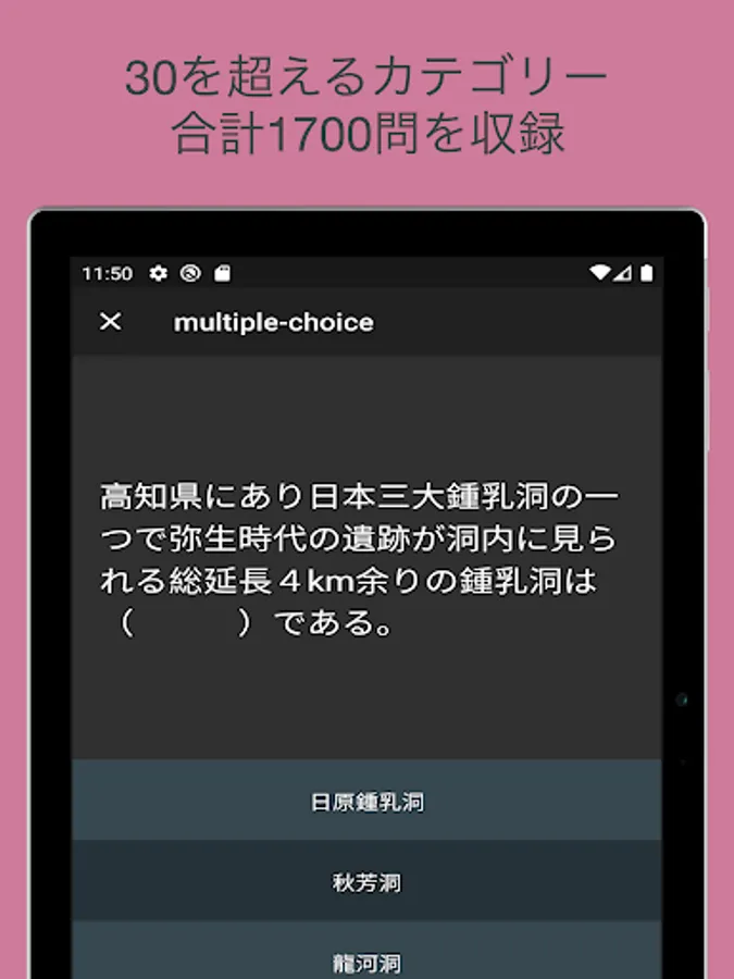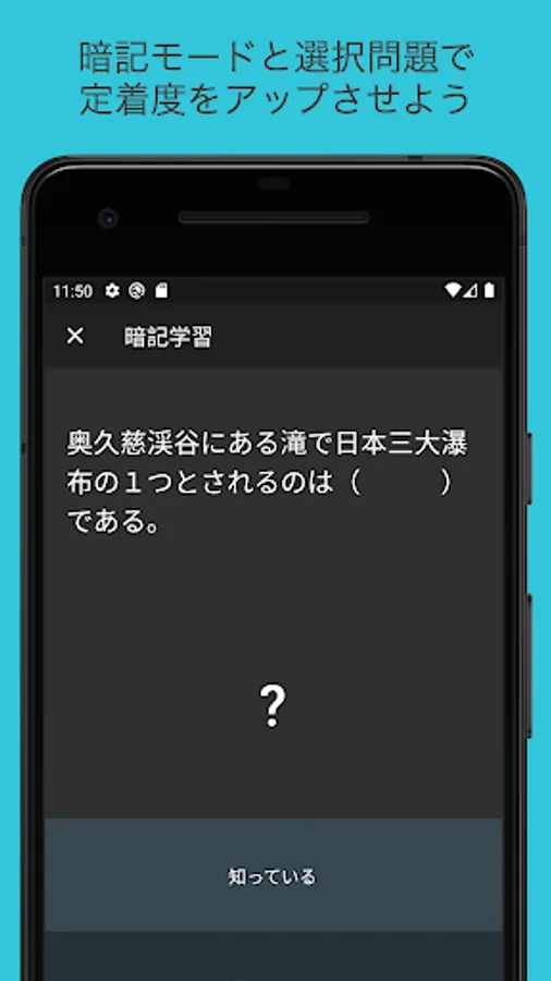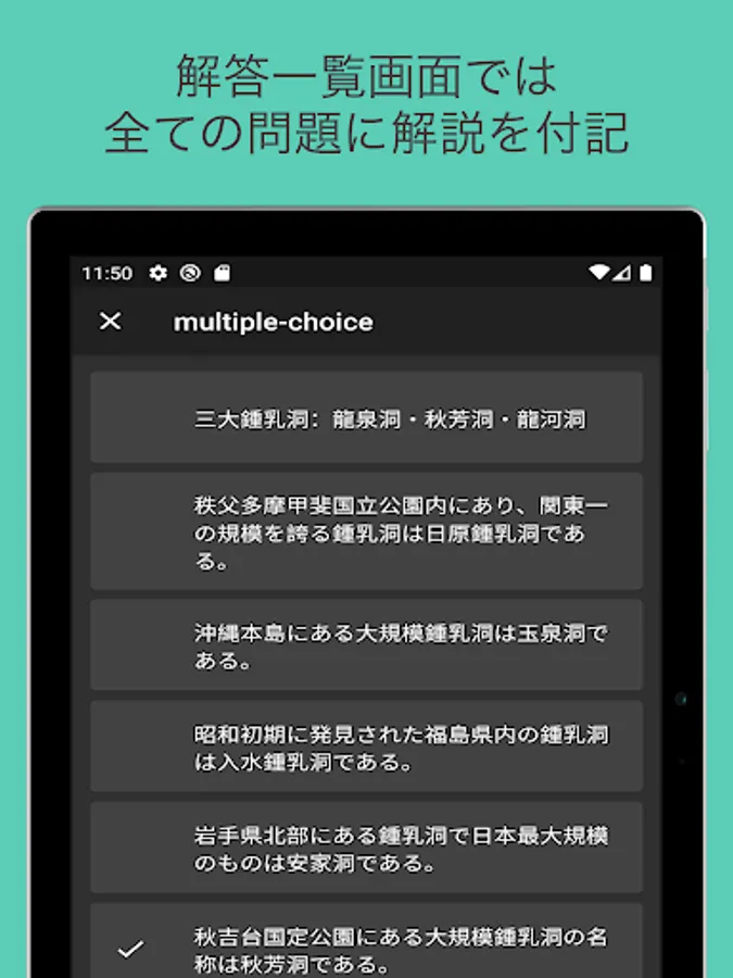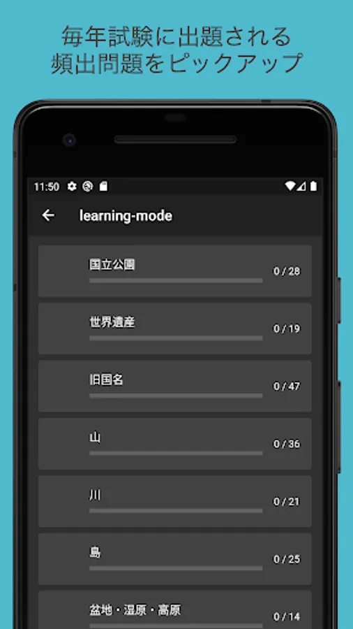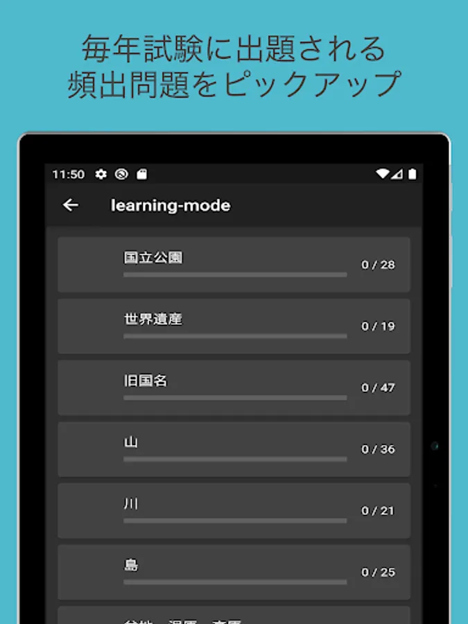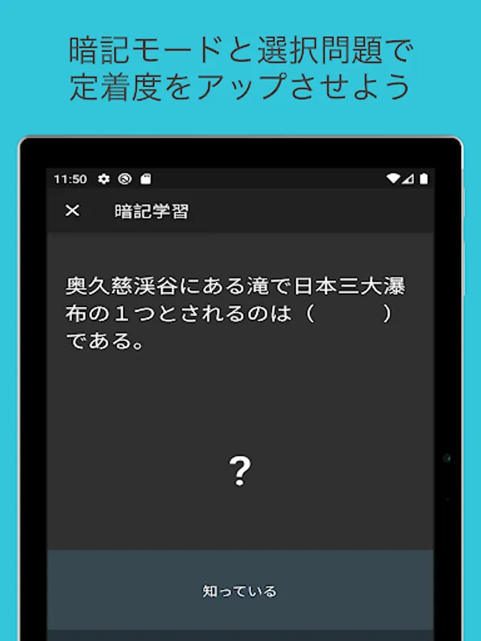 Nihon Geography, which is an annual test, is an application for comprehensively studying Nihon Geography through more than 1,700 vacant space replacement/choice questions.