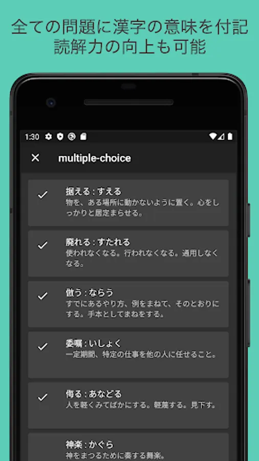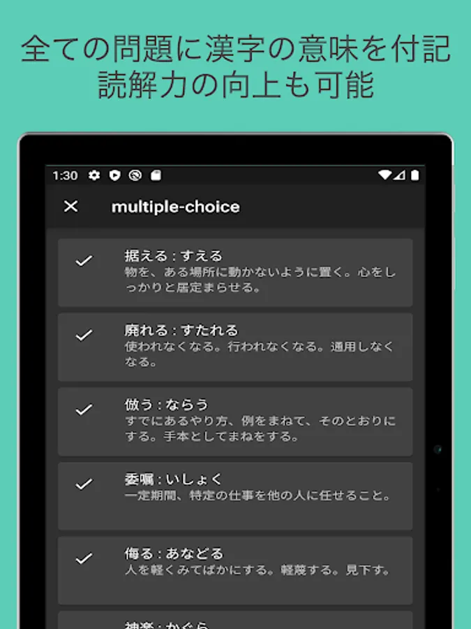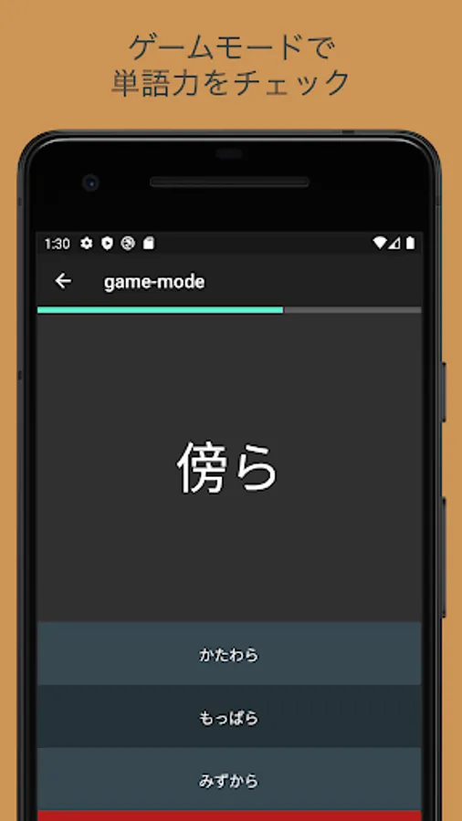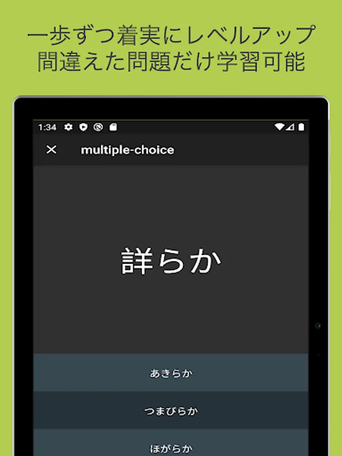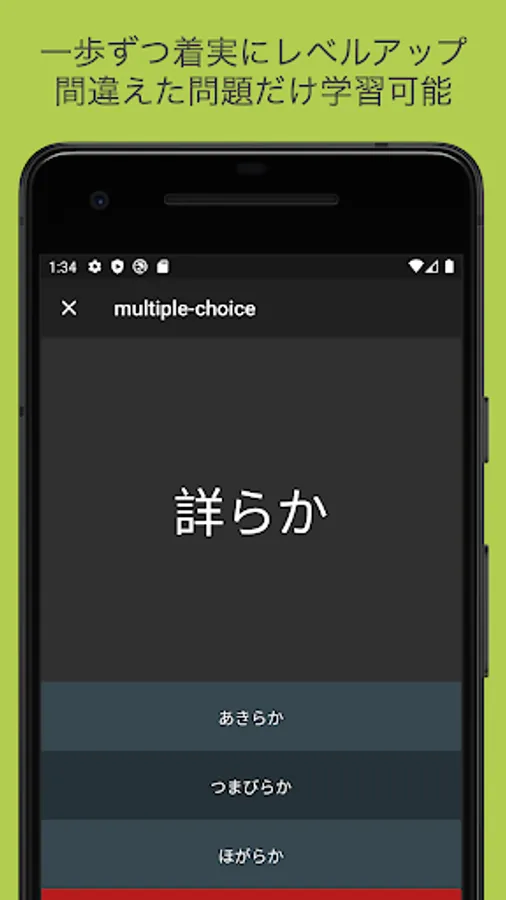 ここでは表示された問題に最も適切な答えを3つの選択肢の中から選択します。答えが分からない場合は適当な選択肢をタップするのではなく「分からない」を選ぶようにしてください。約10問が1つのレッスンになっているため、レッスンの問題全てに回答した後、正解を確認することが可能です。