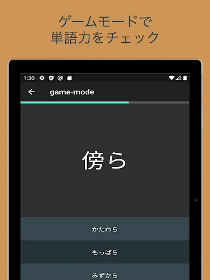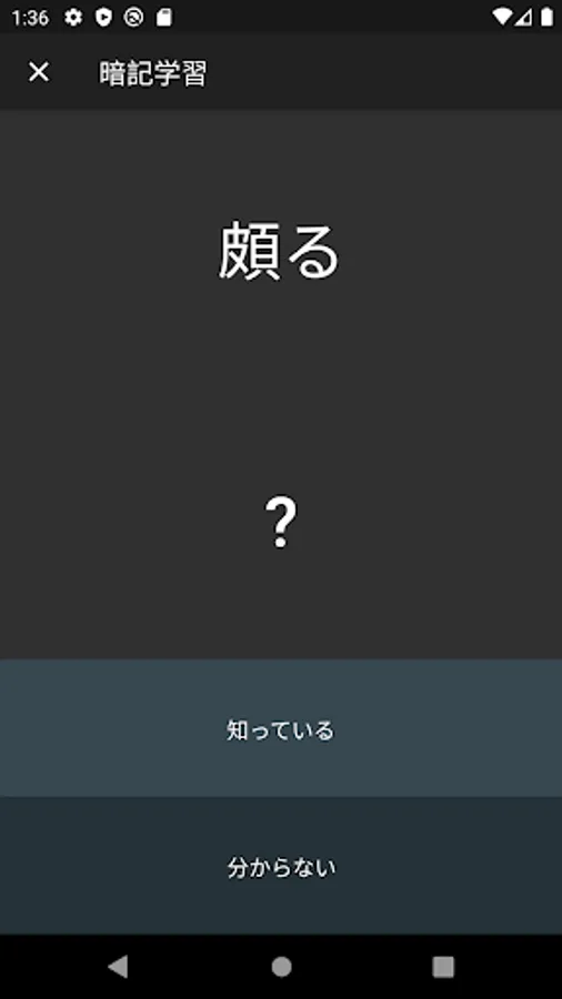 ここでの目的は単語を暗記することです。画面の「?」部分をタップすることで正解が表示されます。表示された単語を知っていれば「知っている」知らなければ「分からない」を選択してください。単純な作業ですが、暗記カードのようにまずは知っている単語と知らない単語に分けることで、自身の語彙の蓄積と進展具合を確認することができます。単語と一緒に音声も流れるので、同時に発音やアクセントもチェック可能です。全ての問題が正解になると次のレッスンに移動することが可能です。