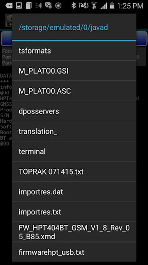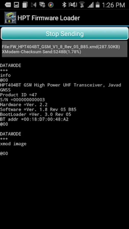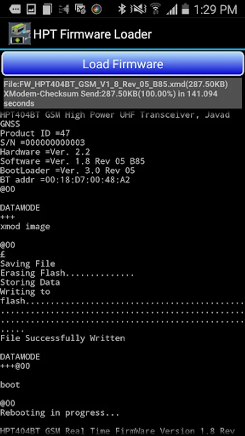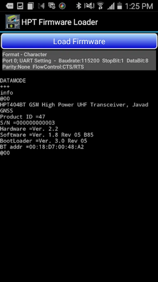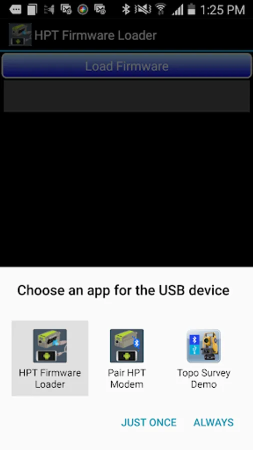 The tool runs at USB connection with Javad HPT radio to Android device. It connects to the radio and shows it's firmware. Press Download Firmware button, select new firmware file and it uploads firmware to the radio.
