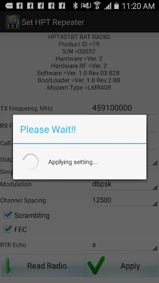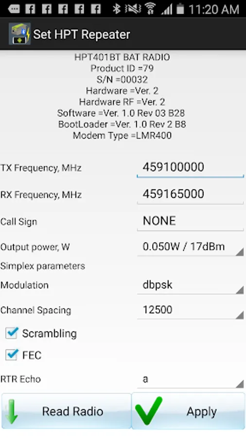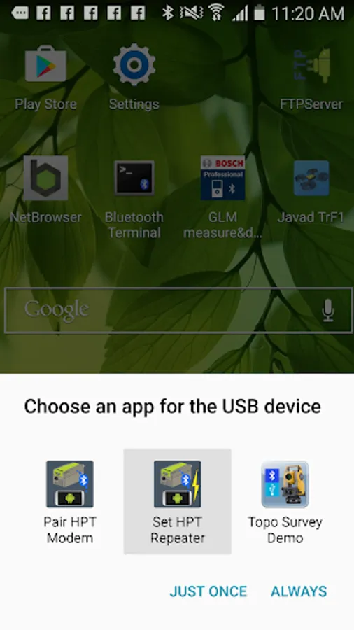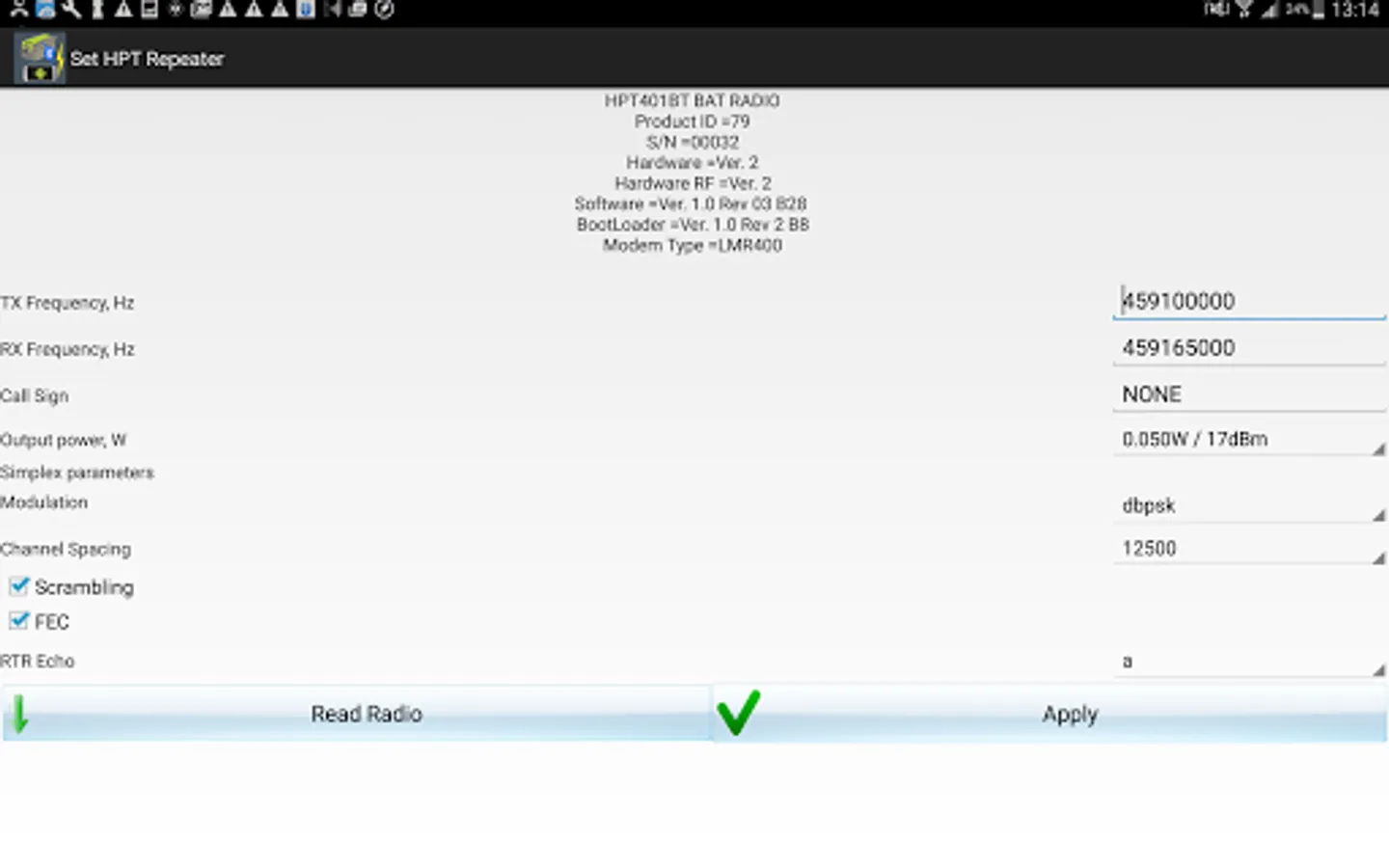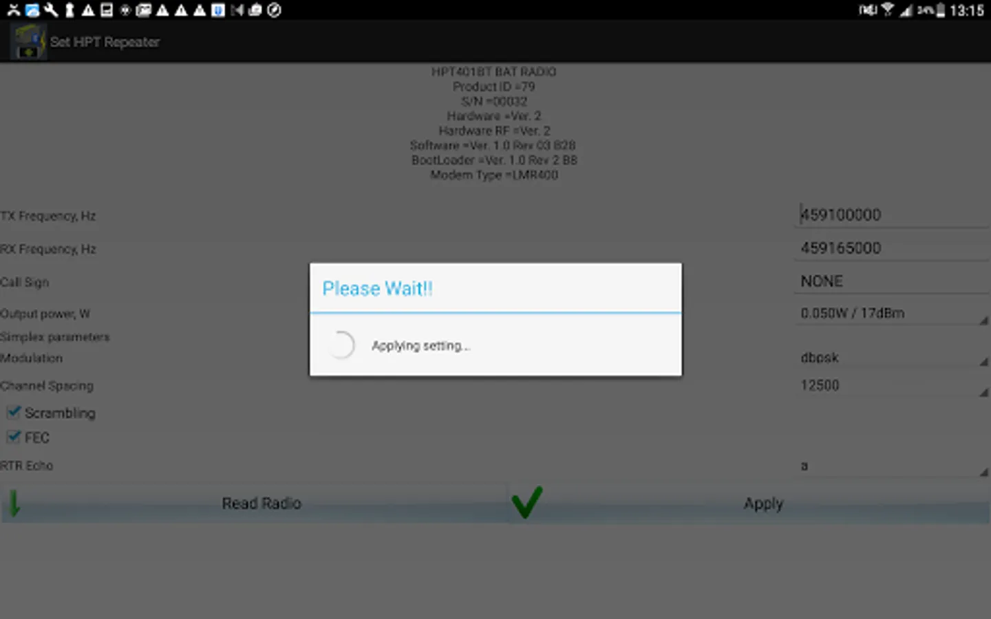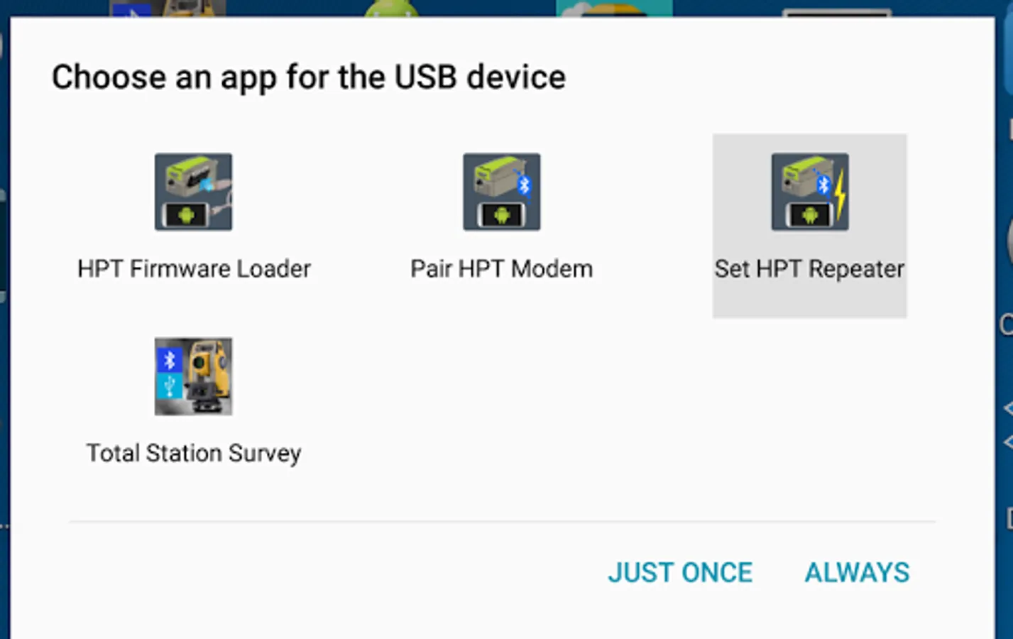 The application is designed to setup JAVAD GNSS HPT radios as a Repeater. Repeater radio extends range of UHF signals between RTK base and RTK rover with the needle repeater radio. After installation just connect a radio with cable to microUSB connector of your Android device (standard USB-to-microUSB cable is required) and select the application to start.