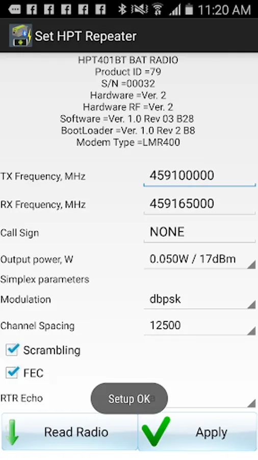 After connection the application reads radio parameters and shows controls to modify them. Press Apply button to setup the radio.