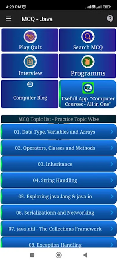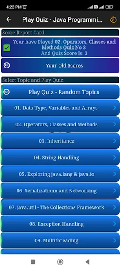 Multiple choice quizzes: Our app includes a variety of quizzes covering all aspects of Java programming, from basic syntax and data types to more advanced topics like multithreading and networking. With over 500 questions to choose from, you'll never run out of ways to challenge yourself and improve your knowledge.