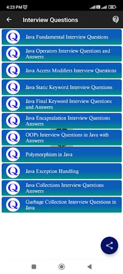 Interview questions and answers: Whether you're preparing for a job interview or just looking to improve your understanding of Java programming, our app includes a range of interview questions and answers to help you prepare. With questions covering everything from basic syntax to more complex topics like concurrency and design patterns, you'll be well-prepared for any Java-related interview.