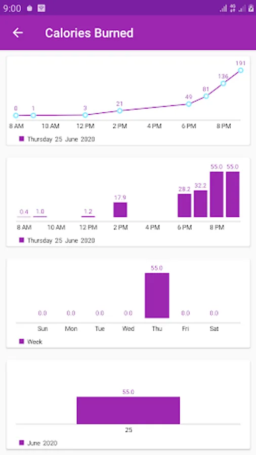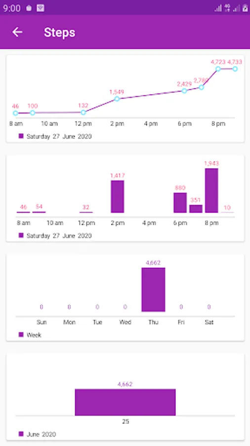 Steps counter is a free and simple app that count you step as you walk or run. The app also calculates the distance traveled and calories burn. The app also computes the speed and pace. Pace means steps per minuet. It also keeps record of previous days. The user can view his records on daily, weekly and monthly bases. Beautiful charts are use to represent old data. The charts have pinch zoom property. It is easy to view the data. Both bar charts and line charts are supported.