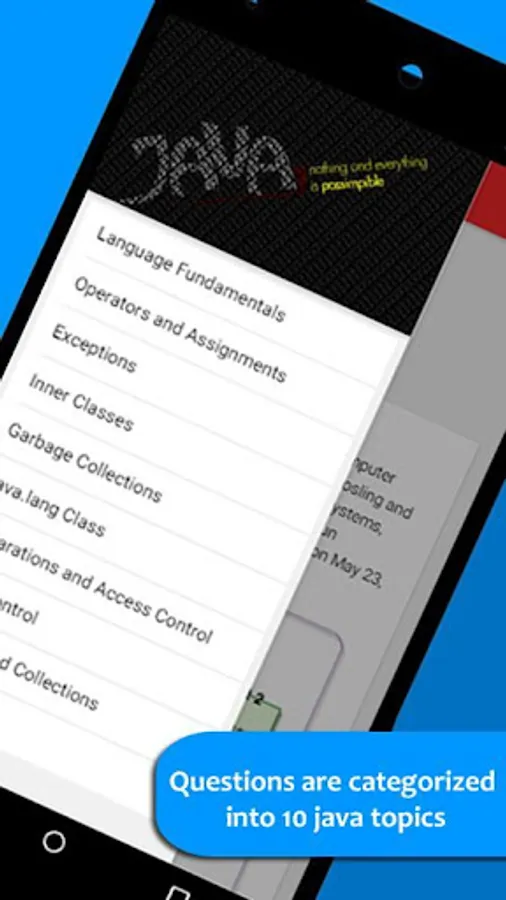This app is based on different categories of Core Java.This app contains 10 categorized , and 220 java questions with solution.Make test and take result at the same time.