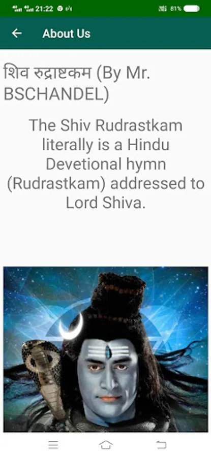 शिव के बारे में क्या बताये शिव ही परब्रम्ह है शिव ही पूर्ण परमात्मा है शिव ही पवित्र है शिव ही सुन्दर है इस संसार में जो भी कुछ है वह शिव का ही है और जो शिव का है उसके लिए लड़ाई कैसी , सब कुछ शिव से ही उत्पन्न हुआ है और एक दिन शिव में ही जाकर विलीन हो जायेगा | व्यक्ति के जीवन की धारा है शिव , हम सभी शिव से बिछड़े हुए है मरने के पश्चात् हम सभी शिव में ही जाकर विलीन हो जाएंगे तब हमे परब्रम्ह परमात्मा के दर्शन प्राप्त होंगे , शिव से प्रेम करो क्योकि शिव ही सम्पूर्ण है शिव भक्त यह एप्प ऑफलाइन भी चलेगी इसको बनाने का उद्देश्य सिर्फ यही है समग्र संसार शिवमय रहे सभी शिव भक्ति में डूबे रहे , क्योकि शिव ही सत्य है