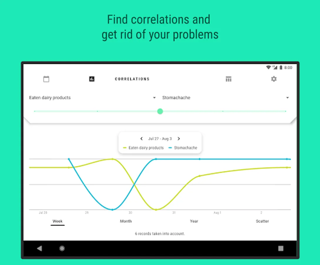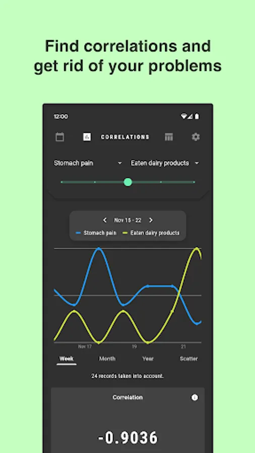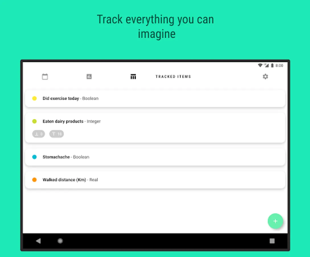 Tracky is the only journal you'll ever need to keep track of your day-to-day habits, problems and progress. You just need to create a category, as many tracked items as you want, and log them daily. Tracky will do the rest with it's advance statistics algorithms to find correlations between those items, helping you fix your sleep quality, stomachache, or whatever you want.
