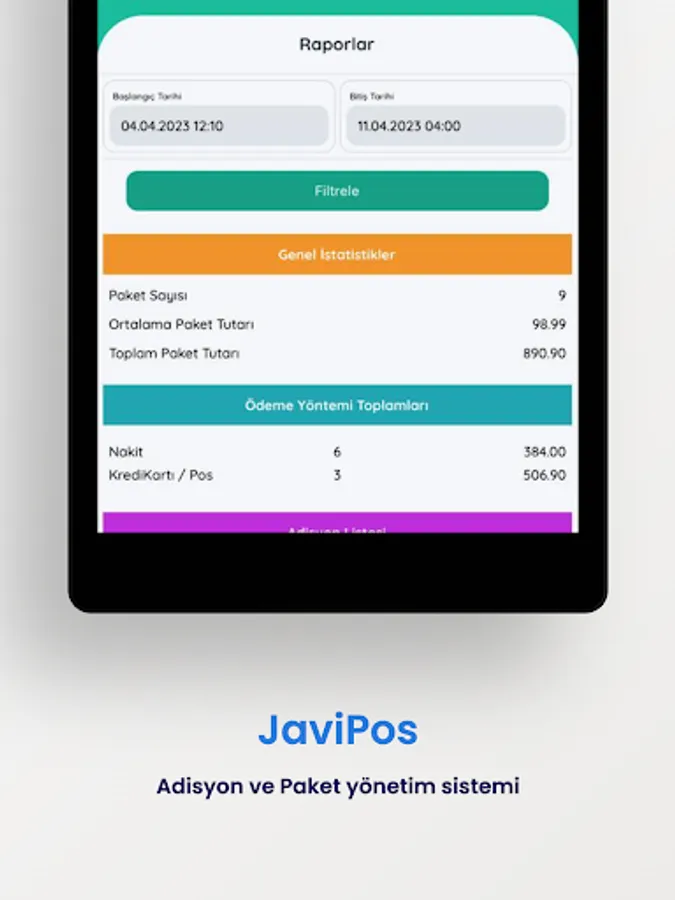 JaviPos is a cloud-based ticket management system. It works fully integrated, stable and seamless with all online ordering channels (YemekSepeti, GetirYemek, TrendyolYemek, MigrosYemek, DeliveryHero, GoFody). It meets all the needs of your business such as Table, Self Sale, Package. With our advanced reporting infrastructure, you can instantly access the reports of orders in your business, either from our mobile application or from our web applications!