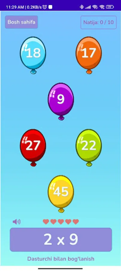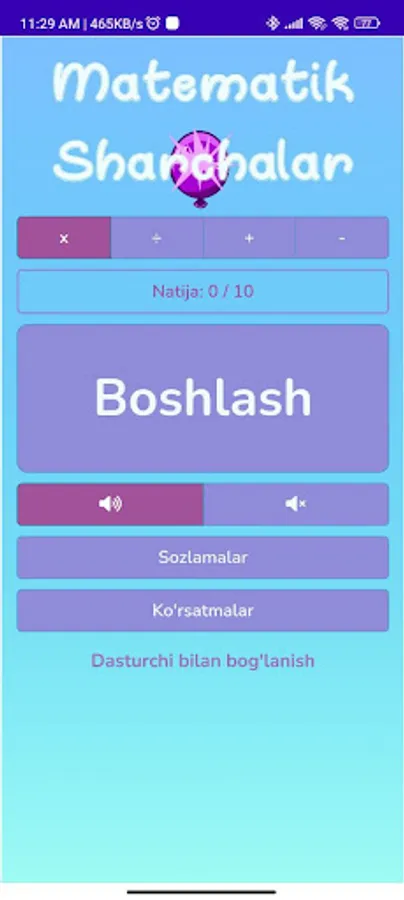 Matematik Sharchalar - bu matematika bo'yicha ko'nikmalarni mustahkamlash va mustaqil o'rganishni rag'batlantirish uchun mo'ljallangan qiziqarli interaktiv matematik o'yin. O'yin rejimini tanlang (ko'paytirish, bo'lish, qo'shish yoki ayirish), Boshlash tugmasini bosing va o'yinni oching. Savollar soni va qiyinchilik darajasi o'yin variantlarida tanlanishi mumkin. Maqsadli o'rganishga yordam berish uchun maxsus savollar guruhlari ham tanlanishi mumkin. Iltimos, Matematik Sharchalar o'yinini qanday yaxshilashim mumkinligi haqida talab yoki takliflaringiz bo'lsa, men bilan bog'laning!